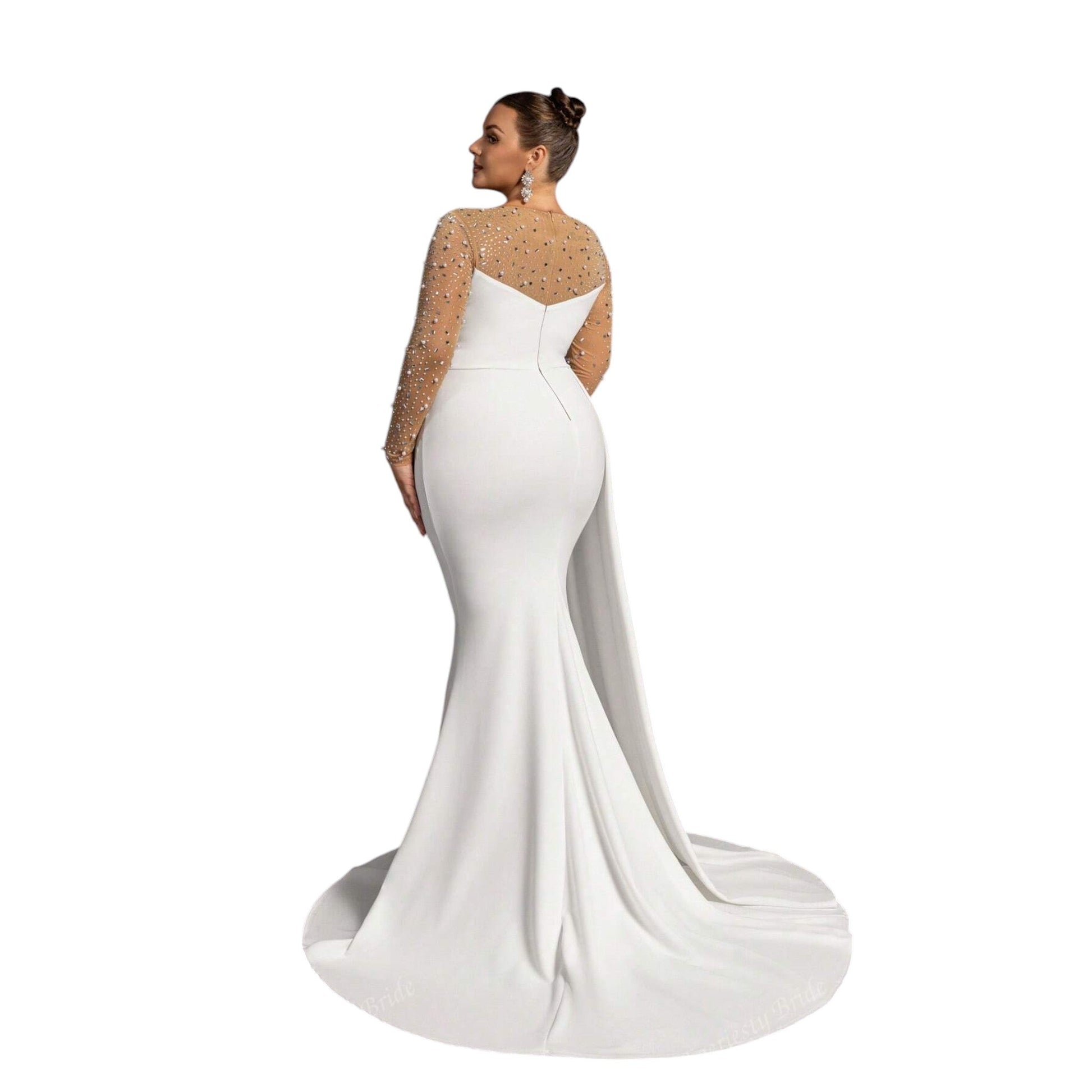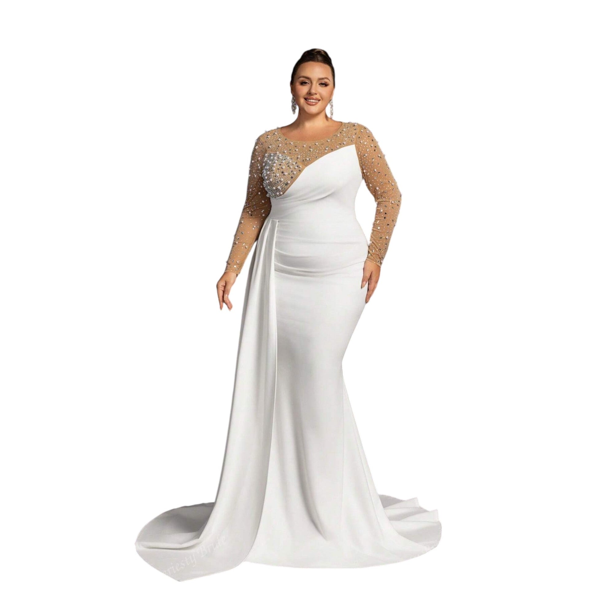 Címke nélküli, fehér, hosszú ujjú, áttetsző és strasszos felsőrésszel, uszállyal.