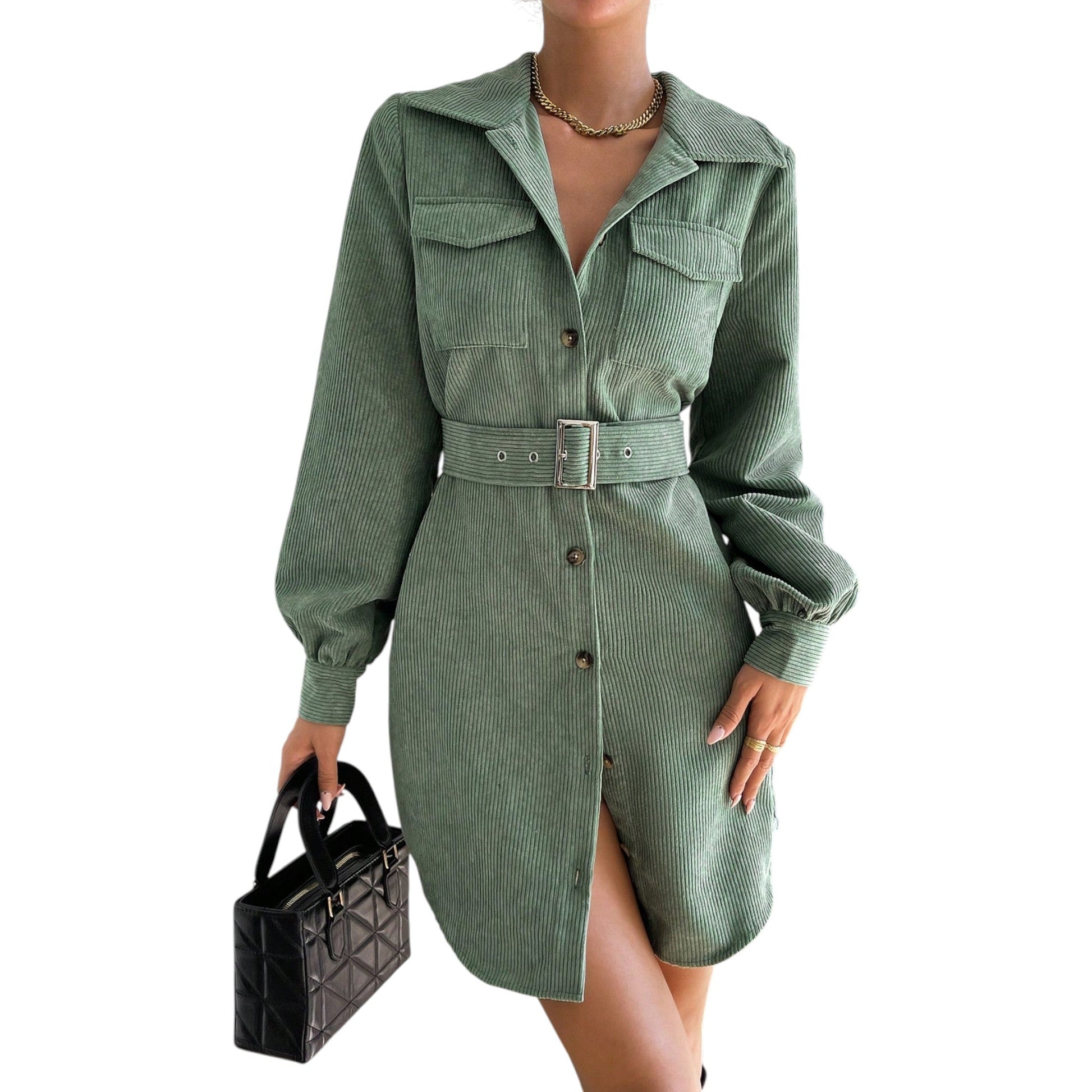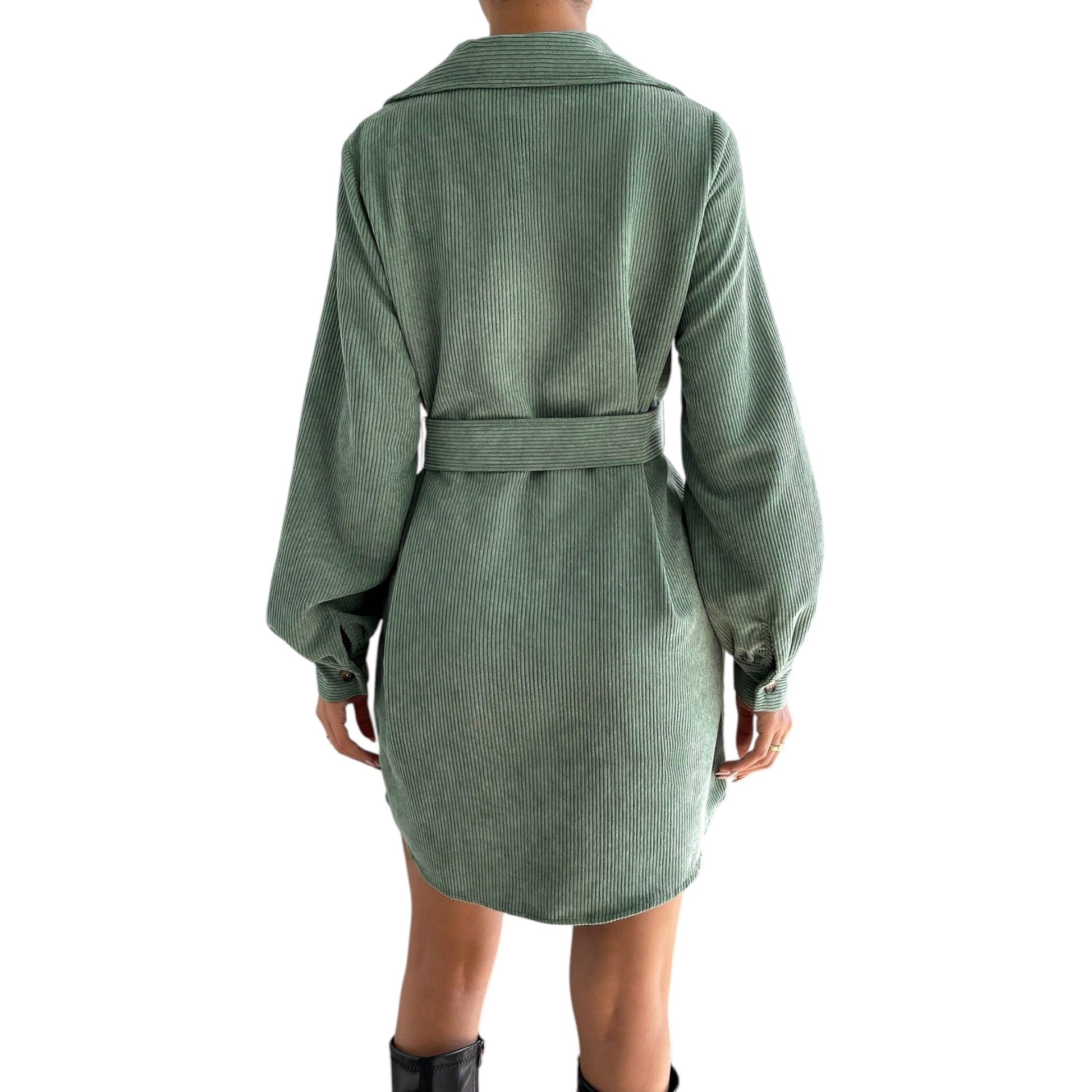 Címke nélküli, zöld, bordázott anyagú, hosszú ujjú, gombos, övvel ellátott midi ingruha.