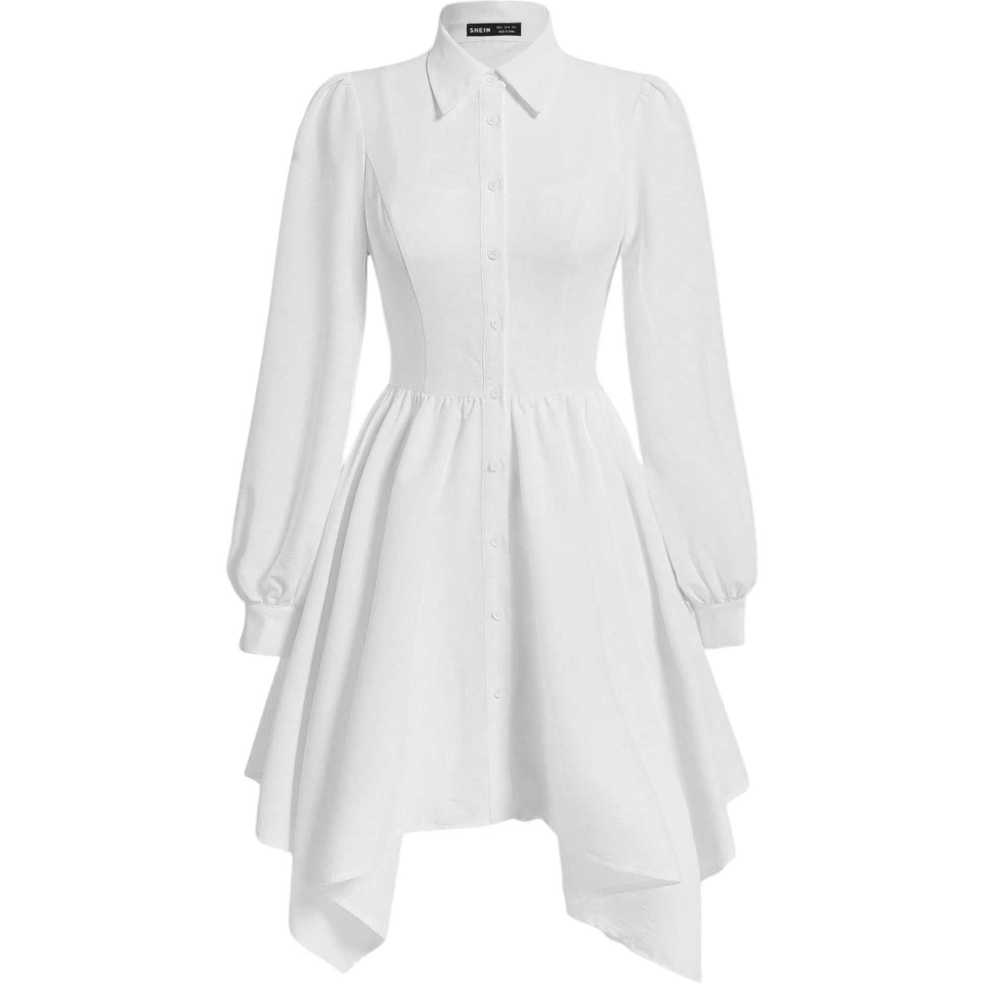 Címke nélküli, fehér, hosszú ujjú, galléros, aszimmetrikus aljú ingruha.