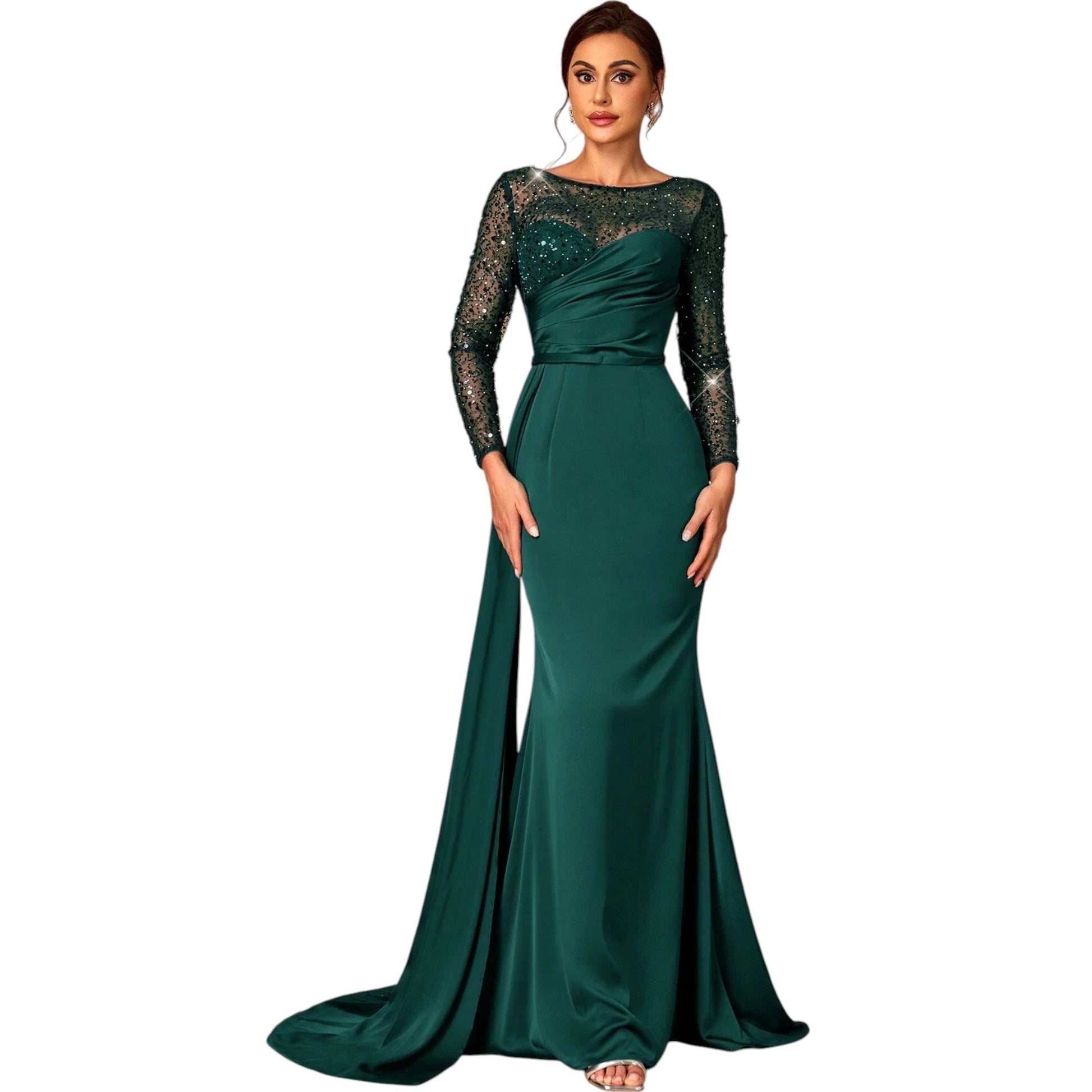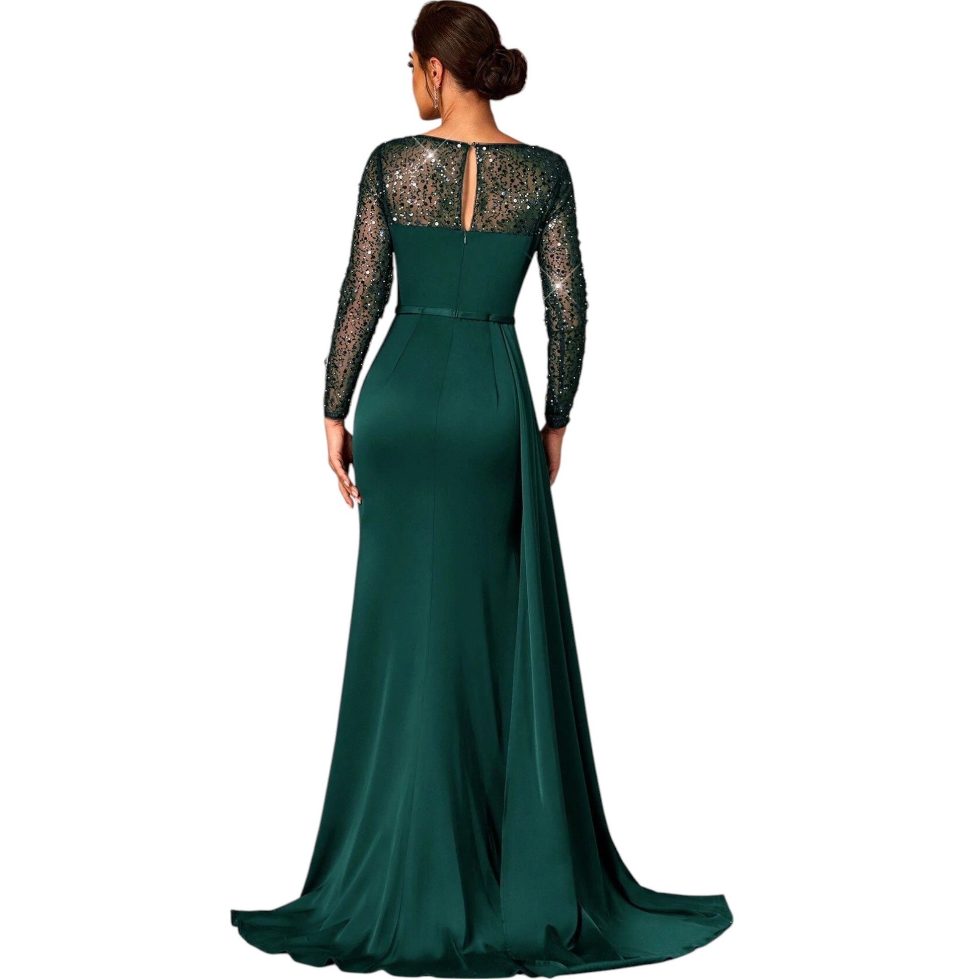 Címke nélküli, smaragdzöld, hosszú ujjú, flitteres felsőrésszel, uszállyal, sellő szabású estélyi ruha.