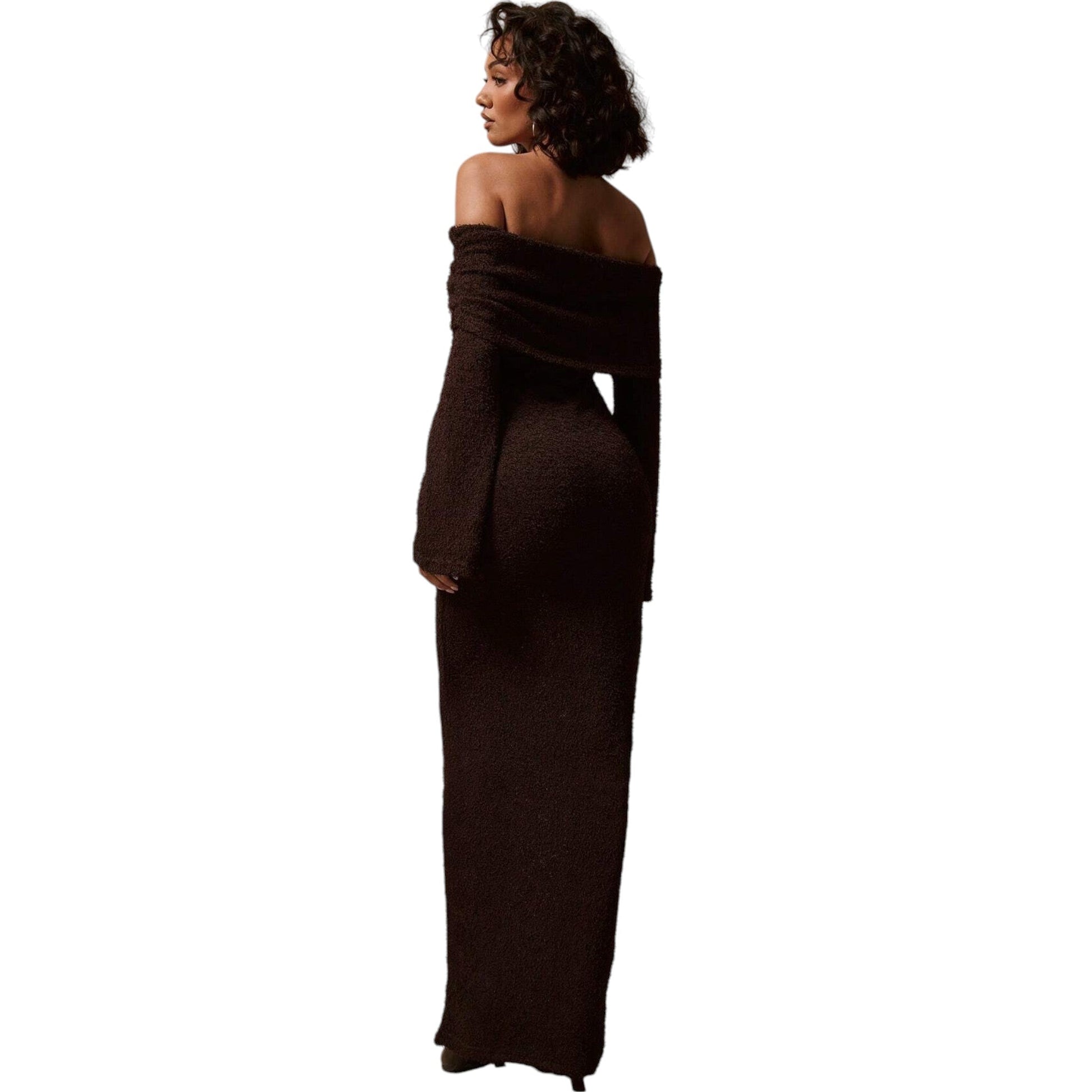 Címke nélküli, barna, ejtett vállú, kötött, hosszú ujjú maxi ruha.