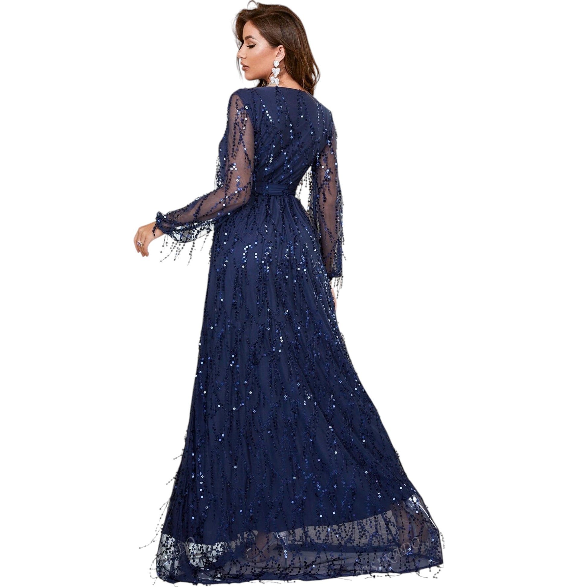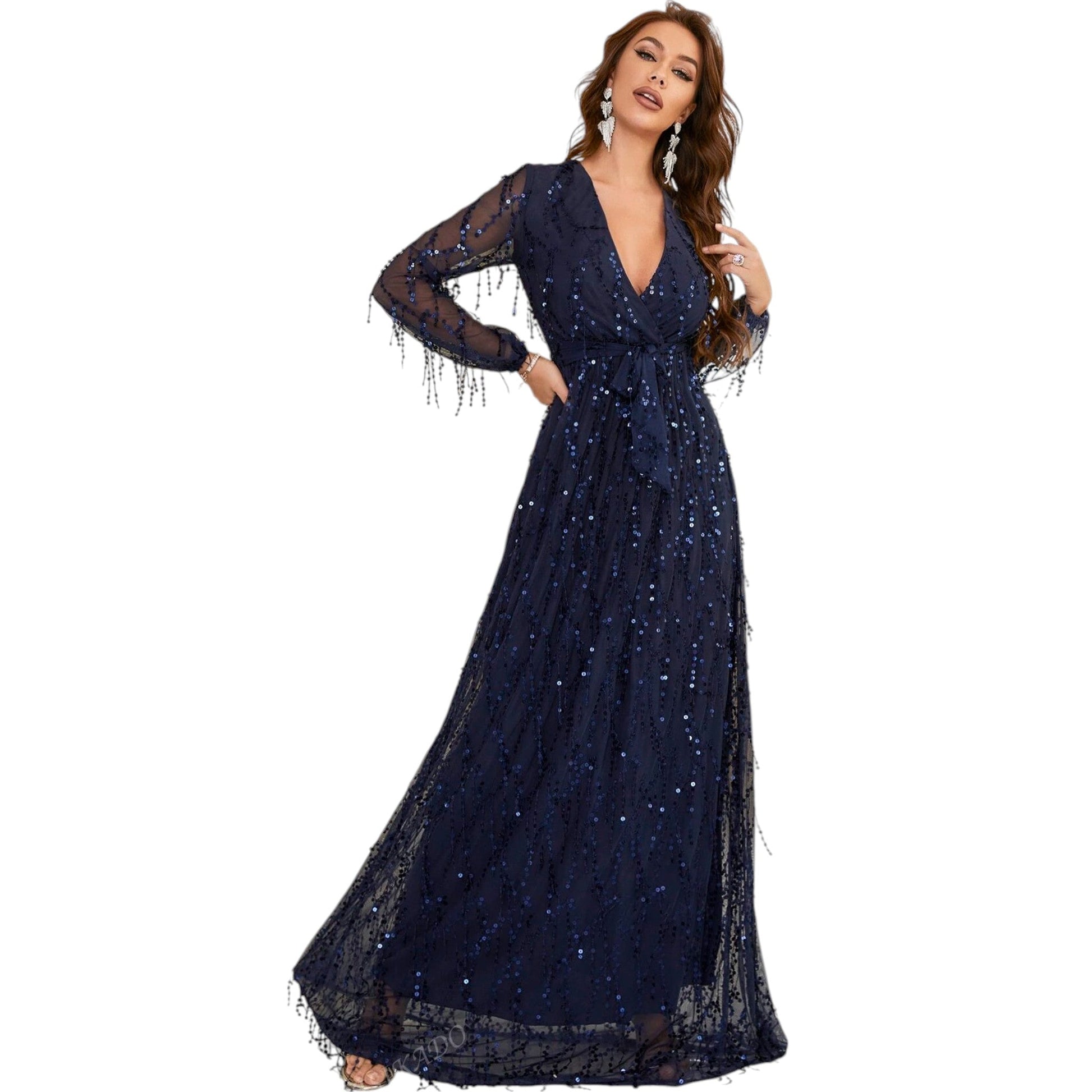 Címke nélküli, sötétkék, flitteres, V-nyakú, hosszú ujjú maxi ruha átlapolt szabással, megkötős derékrésszel és bojtos díszítéssel az ujjakon.