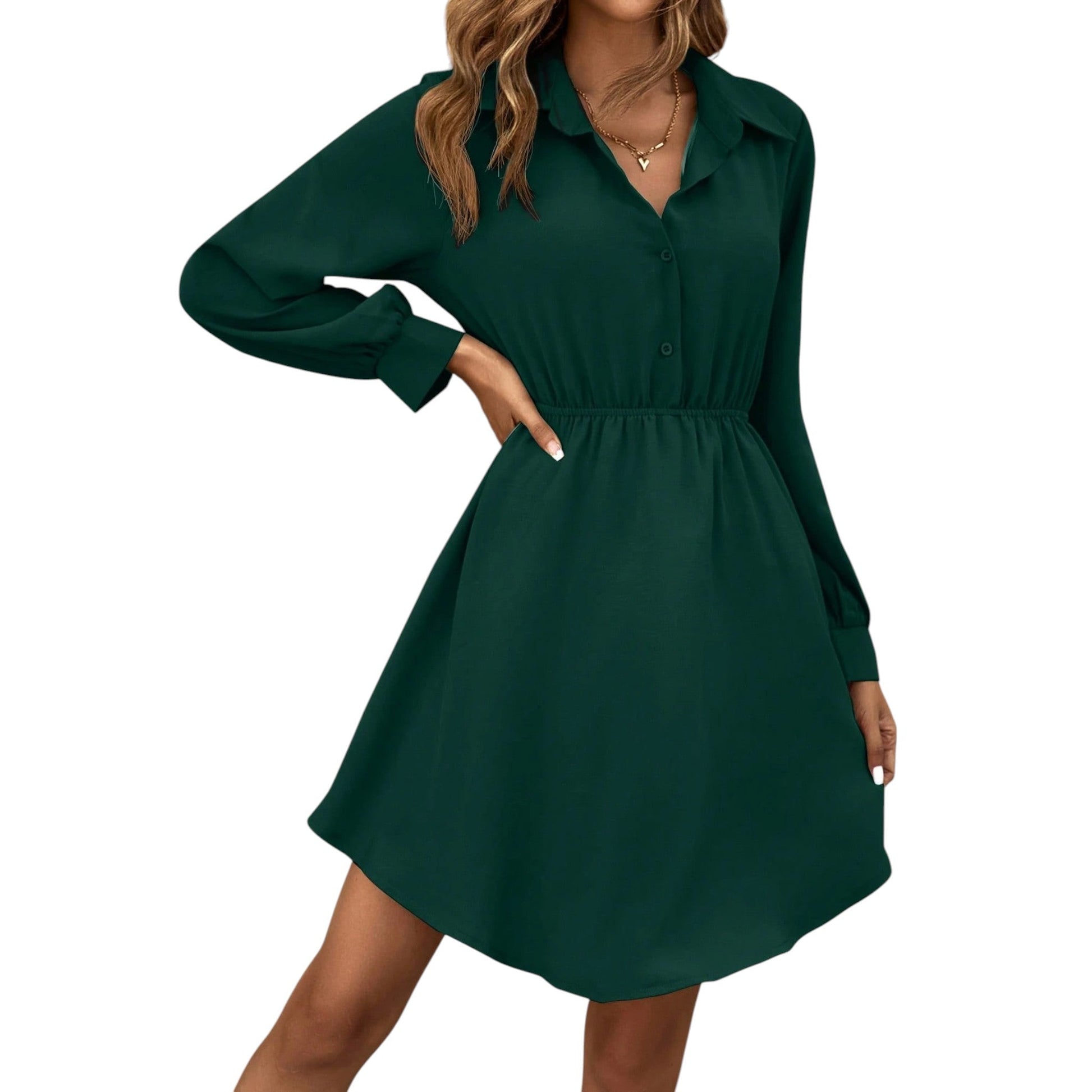 Címke nélküli, sötétzöld, galléros, gombos, hosszú ujjú, gumis derekú mini ruha
