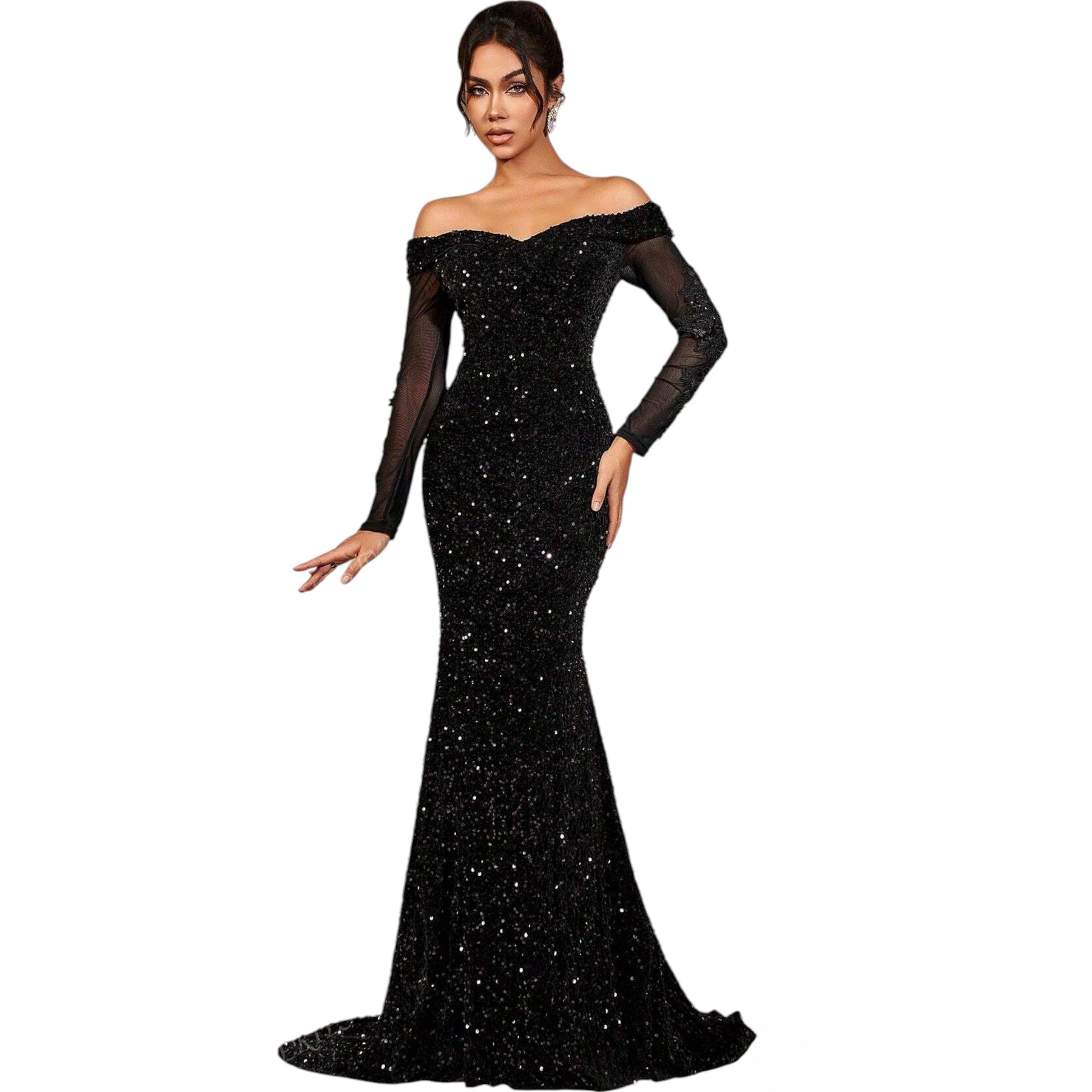 Címke nélküli, fekete, váll nélküli, hosszú ujjú, csillogó, sellő szabású estélyi ruha.