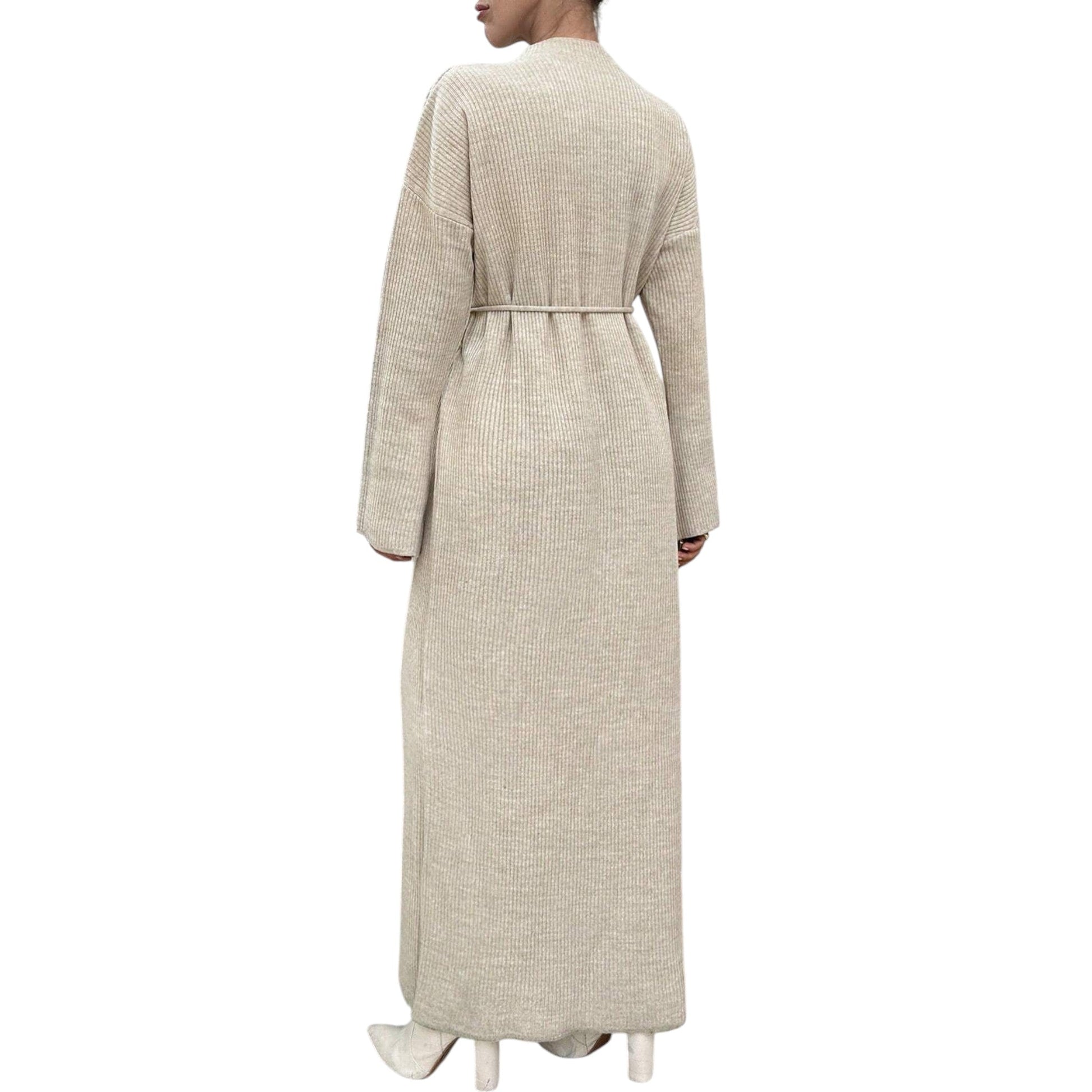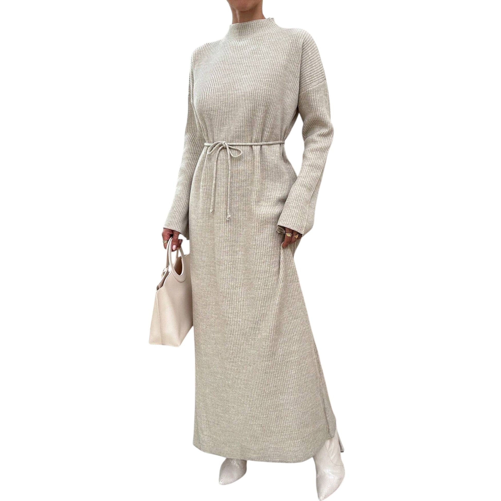 Címke nélküli, bézs, kötött, garbó nyakú, hosszú ujjú, maxi ruha, övvel.