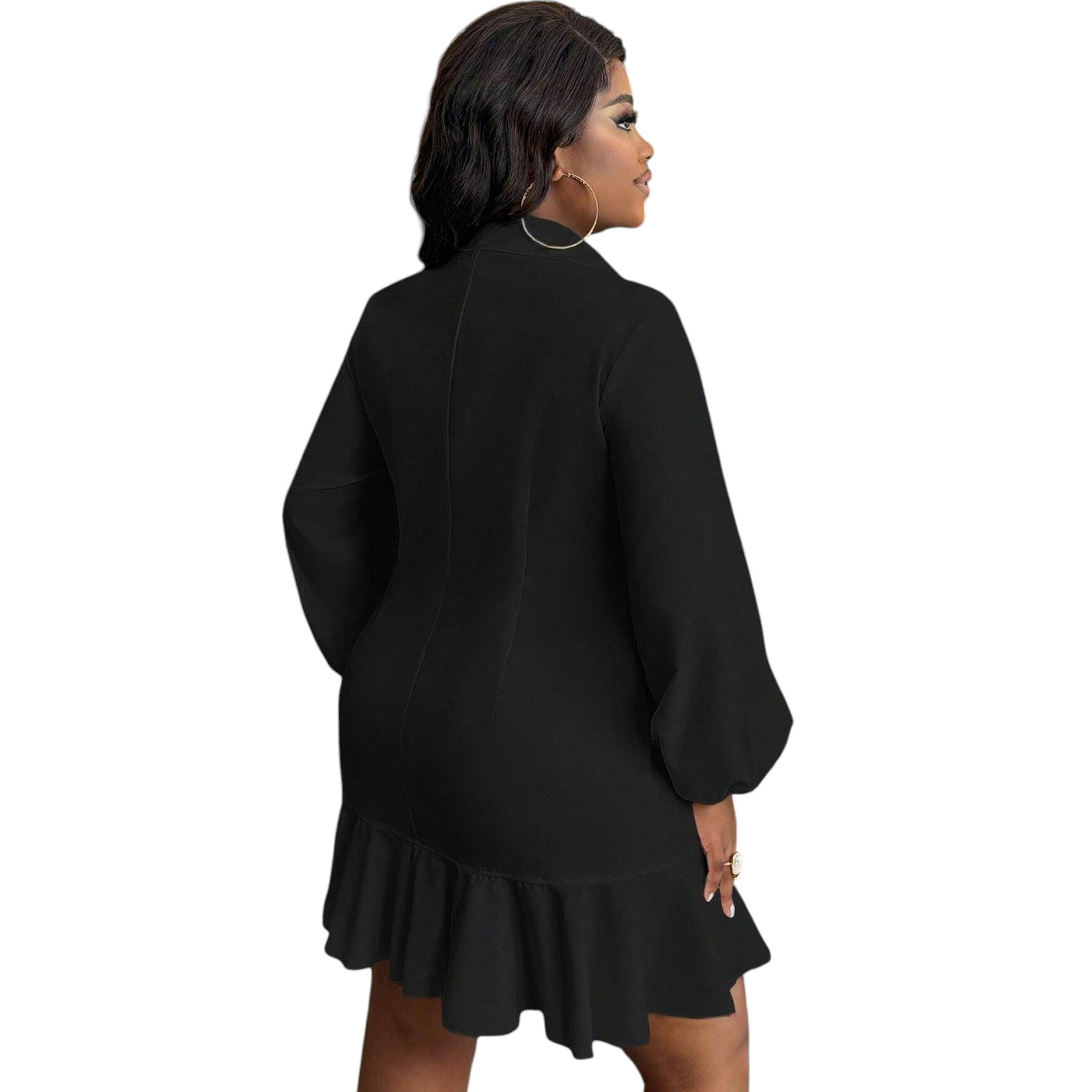 Címke nélküli, fekete, hosszú, bő ujjú, gombos, fodros aljú mini ingruha.