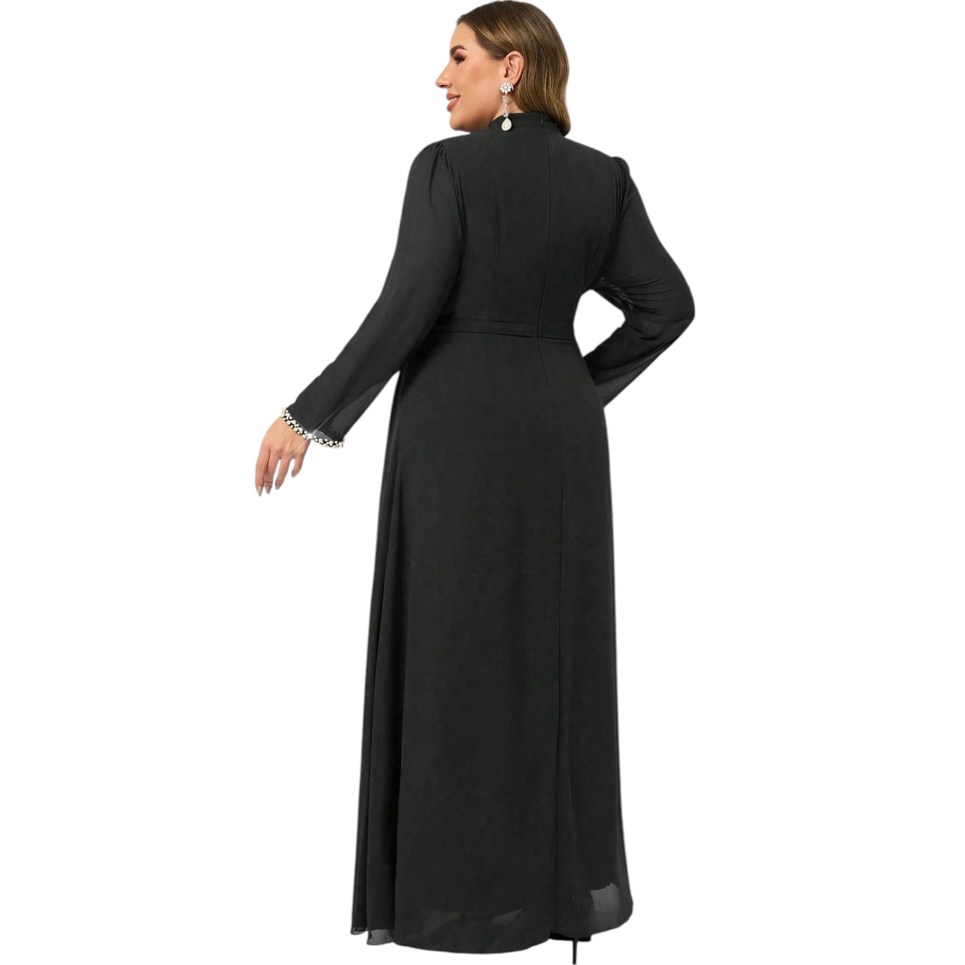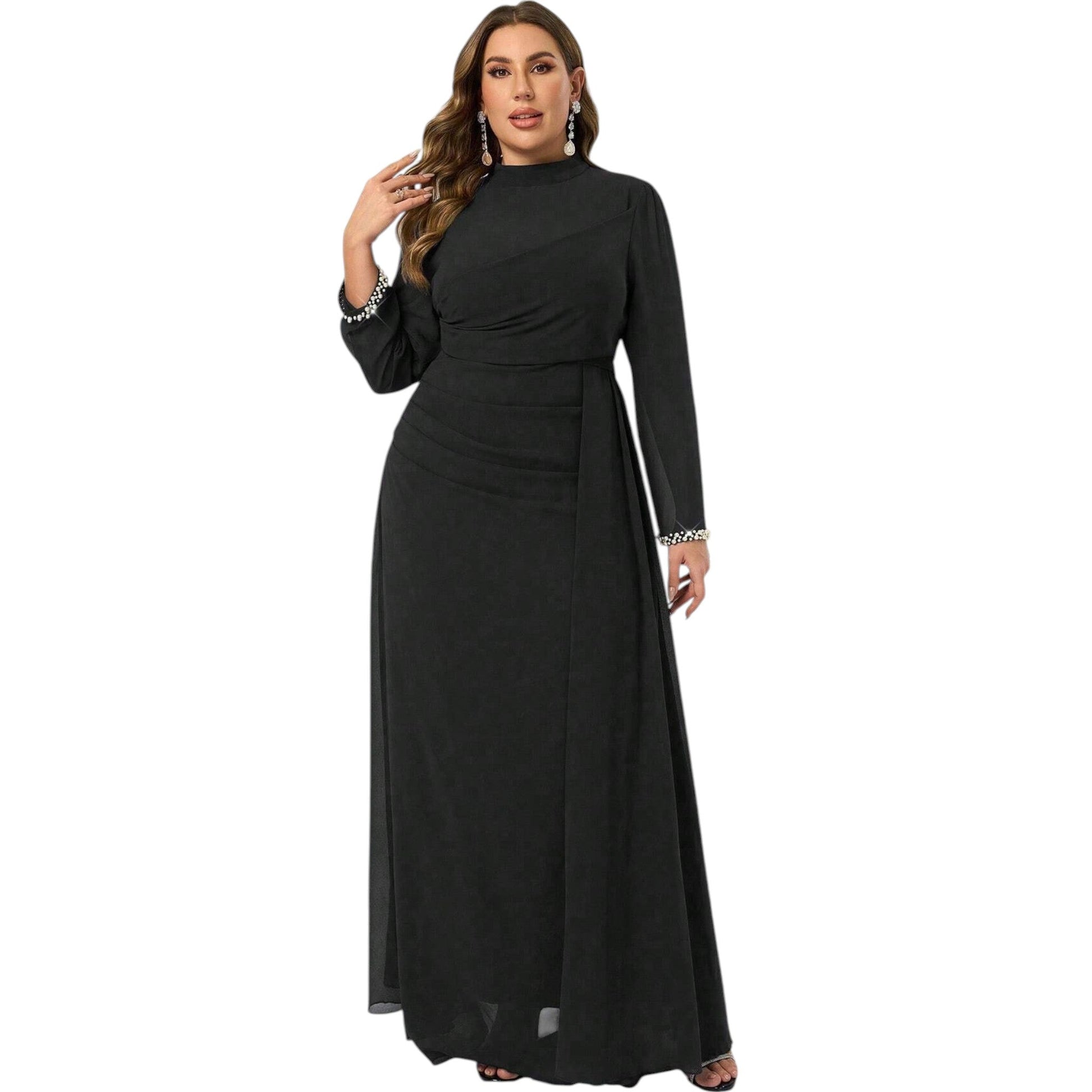 Címke nélküli, fekete, magas nyakú, hosszú ujjú, gyöngyös mandzsettájú, hosszú maxi ruha, elöl ráncolással.