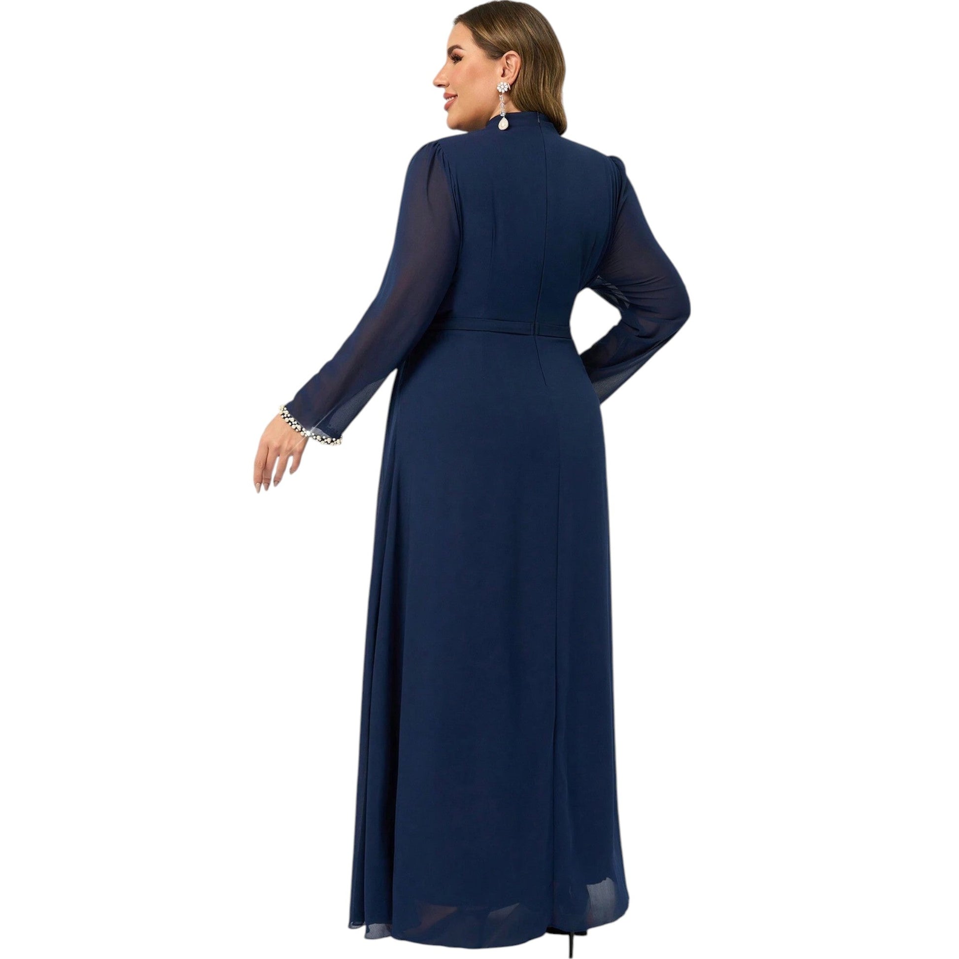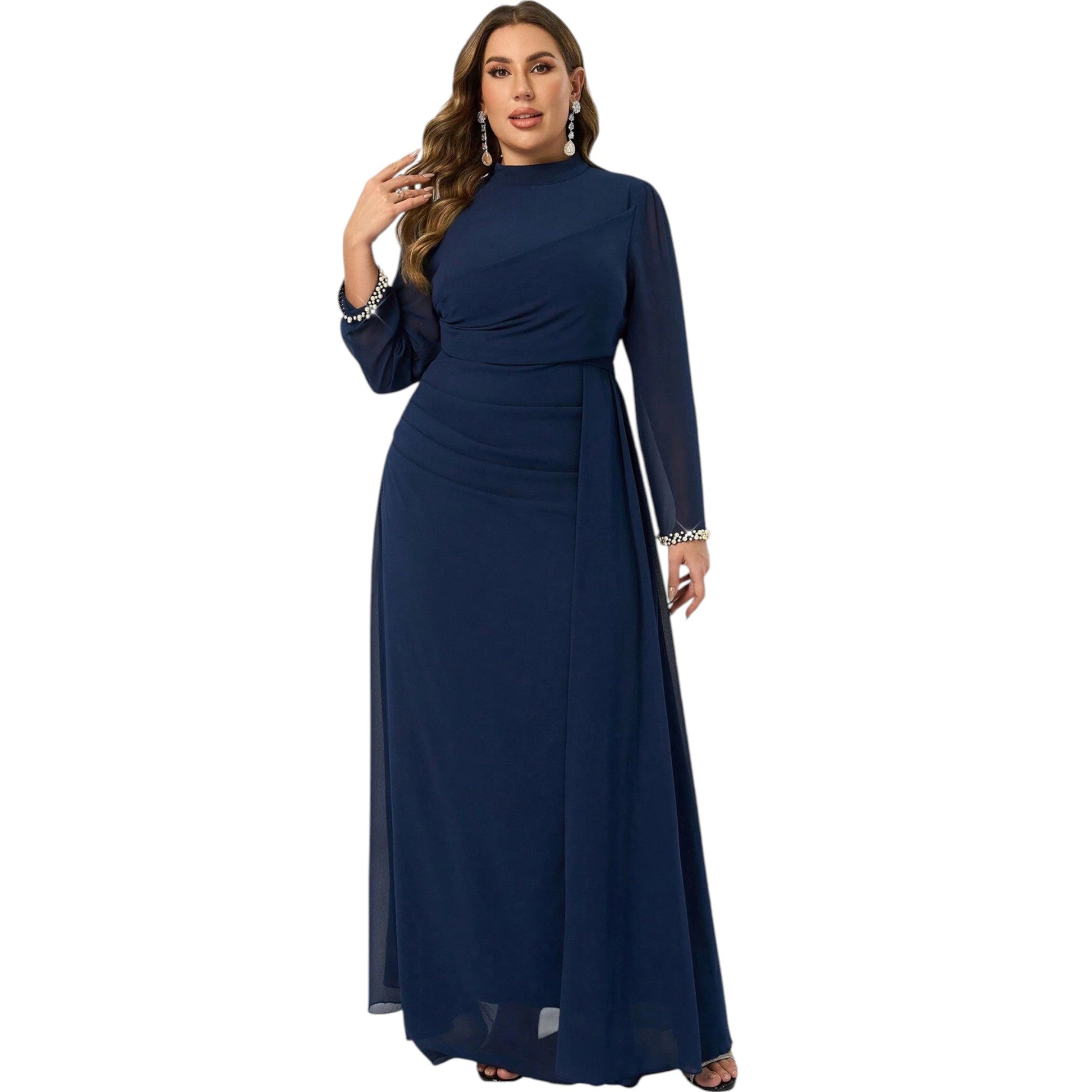 Címke nélküli, sötétkék, magas nyakú, hosszú ujjú, gyöngyös mandzsettájú, hosszú maxi ruha, elöl ráncolással.