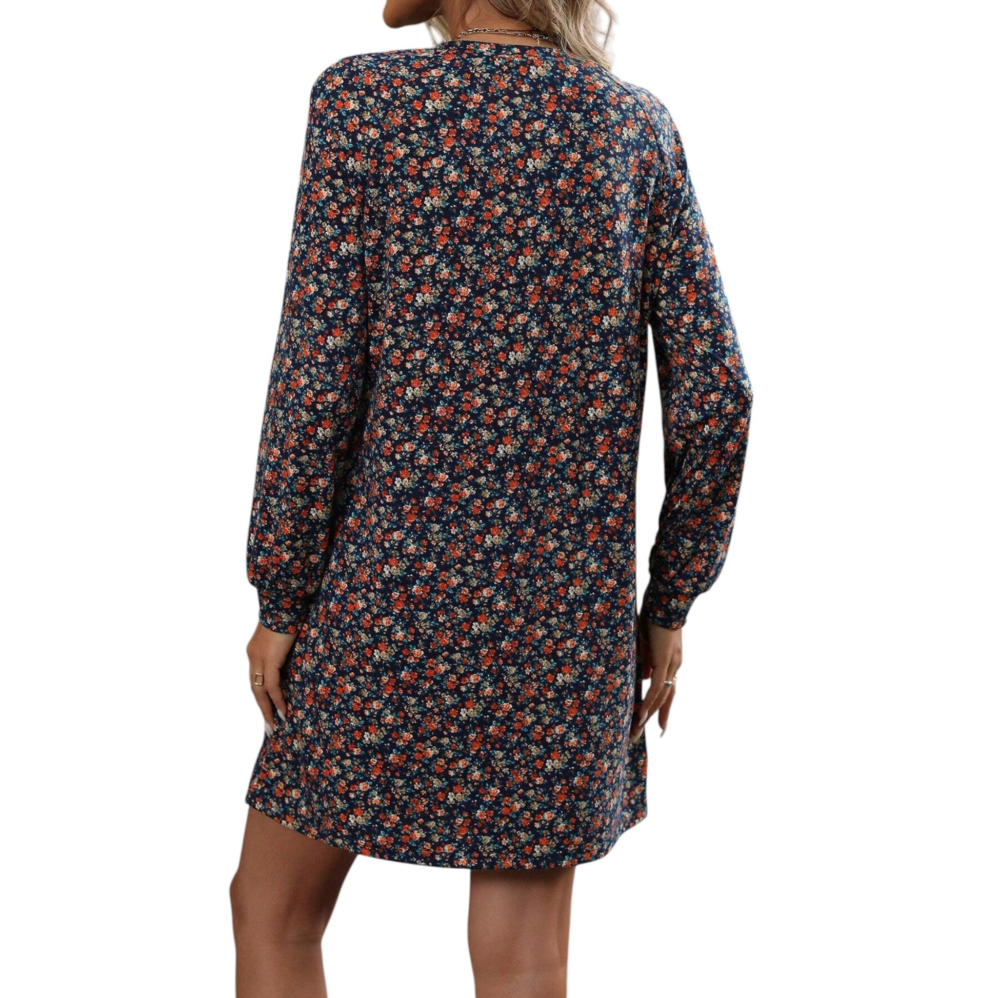 Címke nélküli, sötétkék alapon virágmintás, hosszú ujjú, kerek nyakú mini ruha.