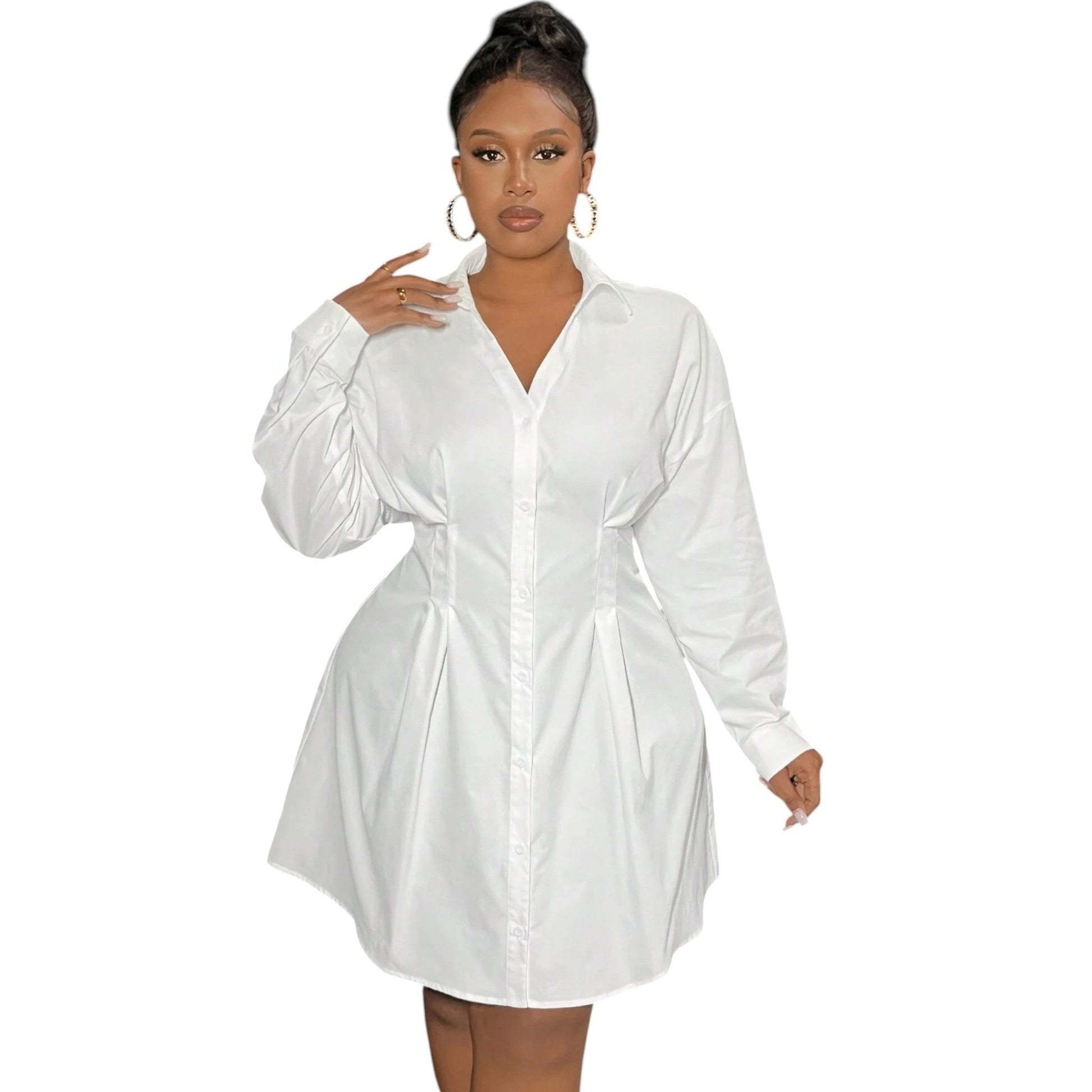 Címke nélküli, fehér, hosszú ujjú, galléros, gombos mini ruha, karcsúsított derékkal.