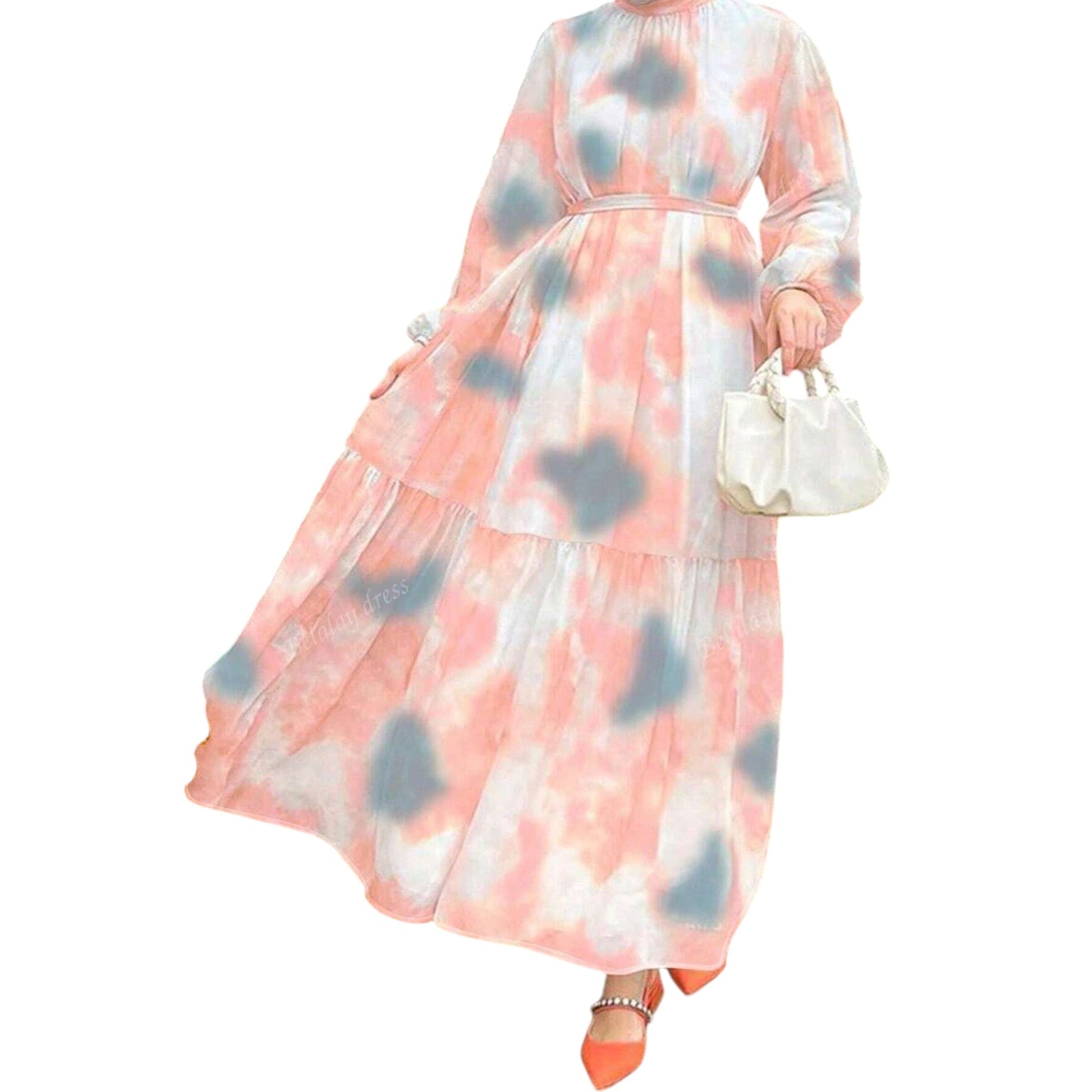 Címke nélküli, rózsaszín, szürke és fehér, batikolt mintás, hosszú ujjú, kerek nyakú, öves, fodros maxi ruha.