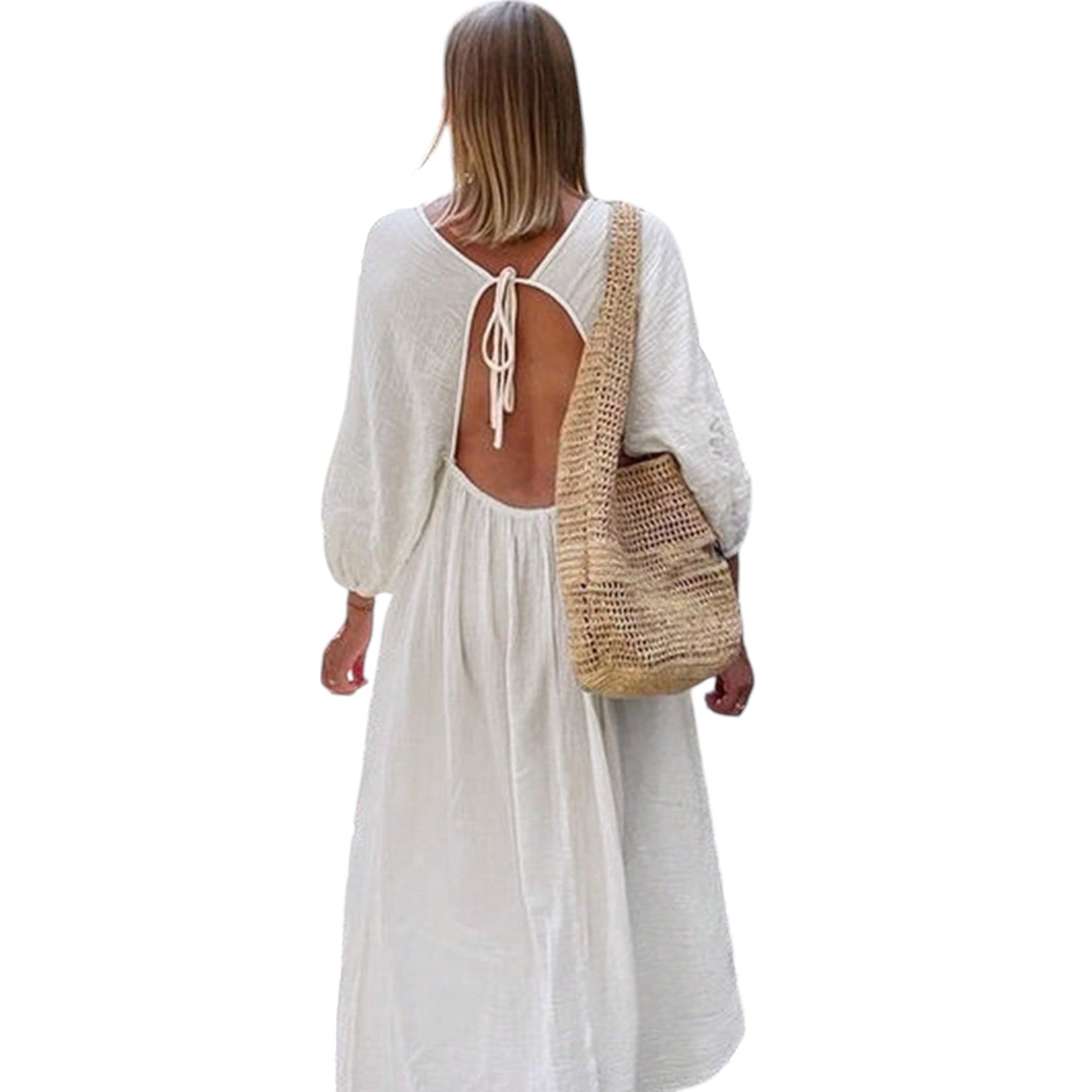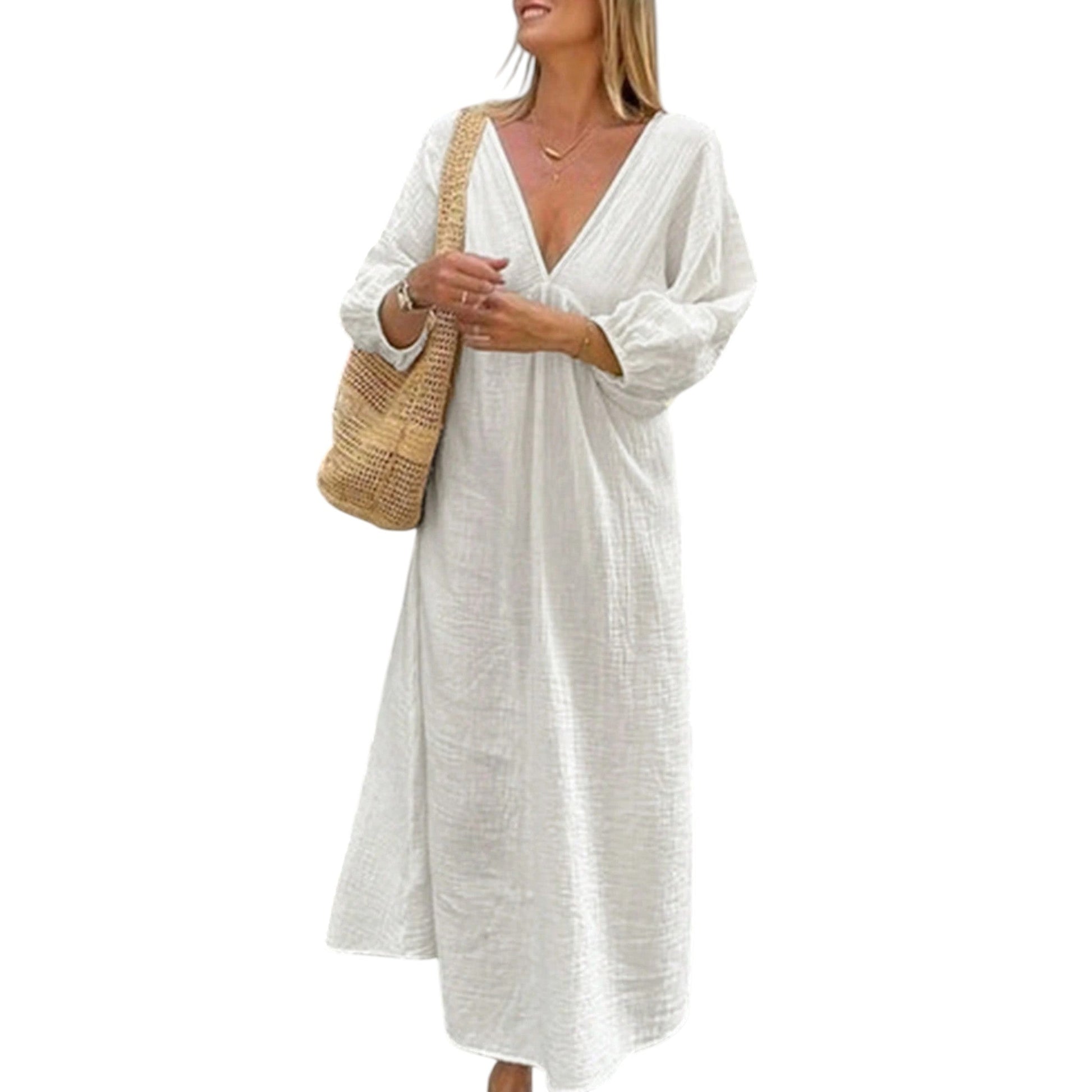 Címke nélküli, fehér, V-nyakú, hosszú ujjú, bő szabású vászon kaftán ruha.