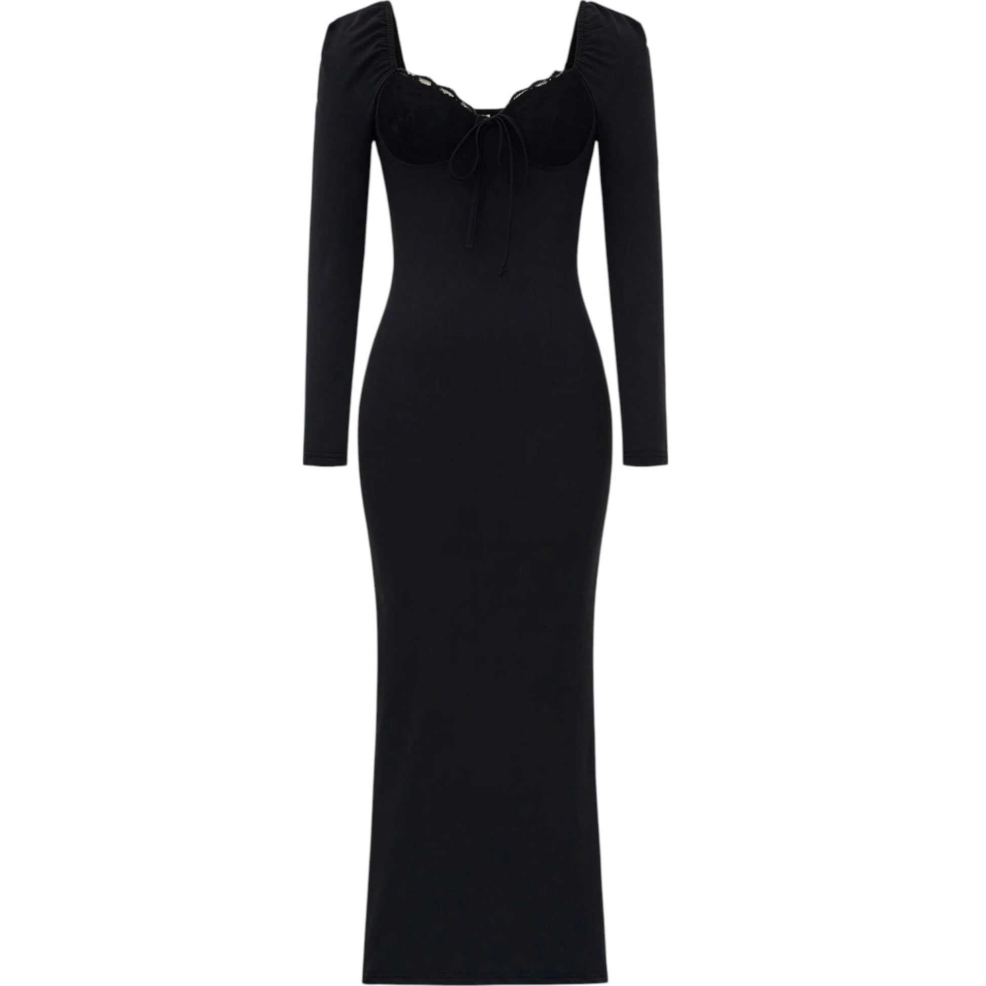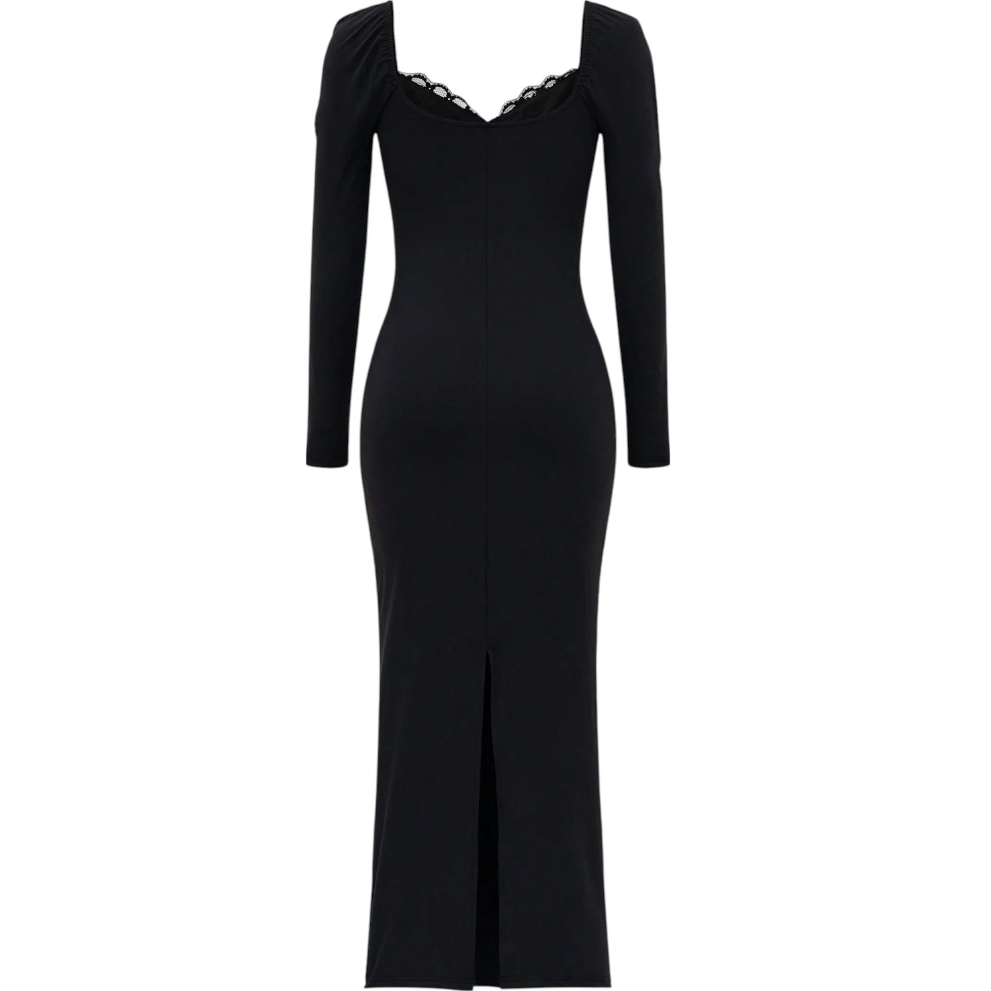 Címke nélküli, fekete, hosszú ujjú, szűk szabású midi ruha, négyzet alakú dekoltázzsal, mellrészen húzott díszítéssel.