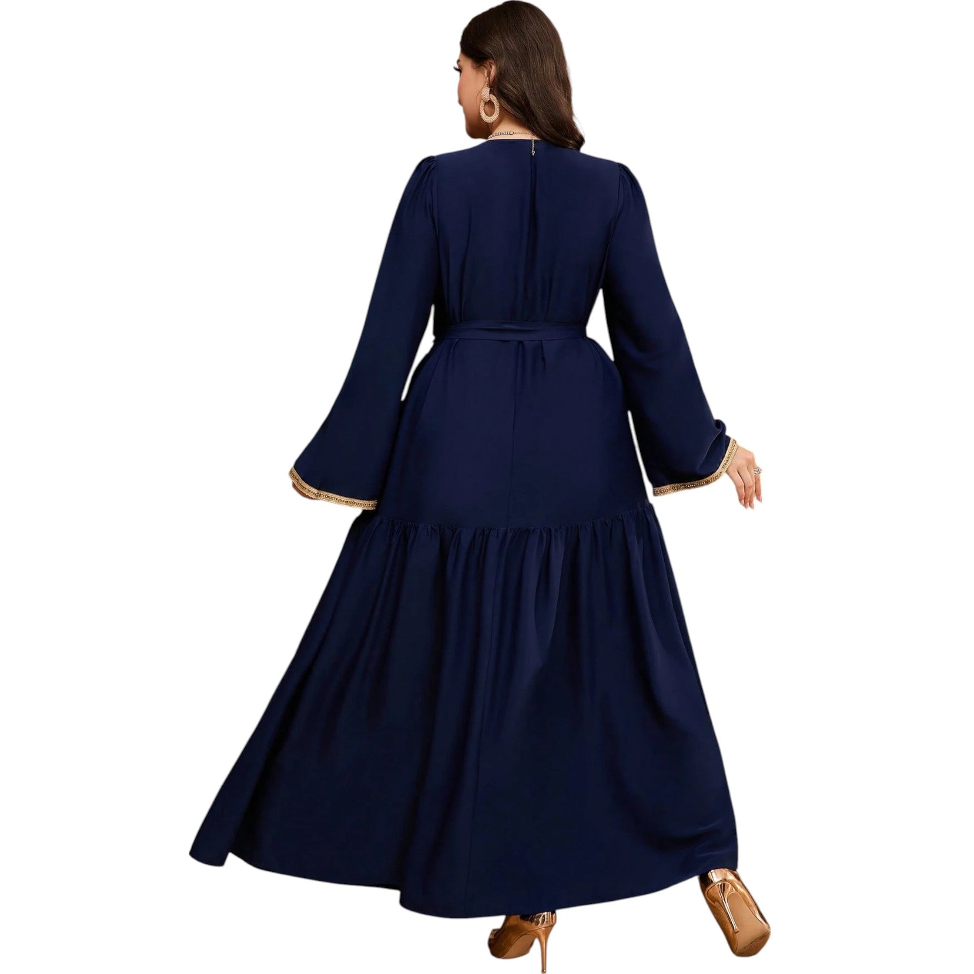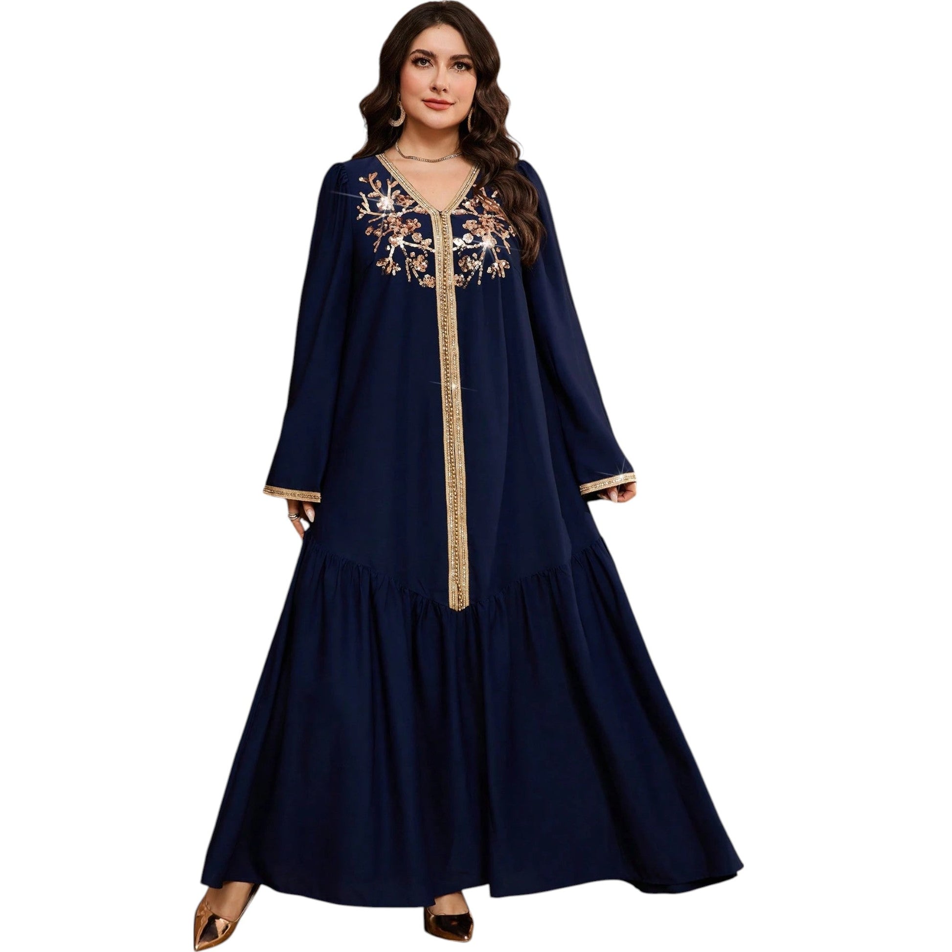 Címke nélküli, sötétkék, hosszú ujjú, V-nyakú maxi ruha, mellrészen és elöl arany színű hímzéssel és paszpollal, alján fodros.
