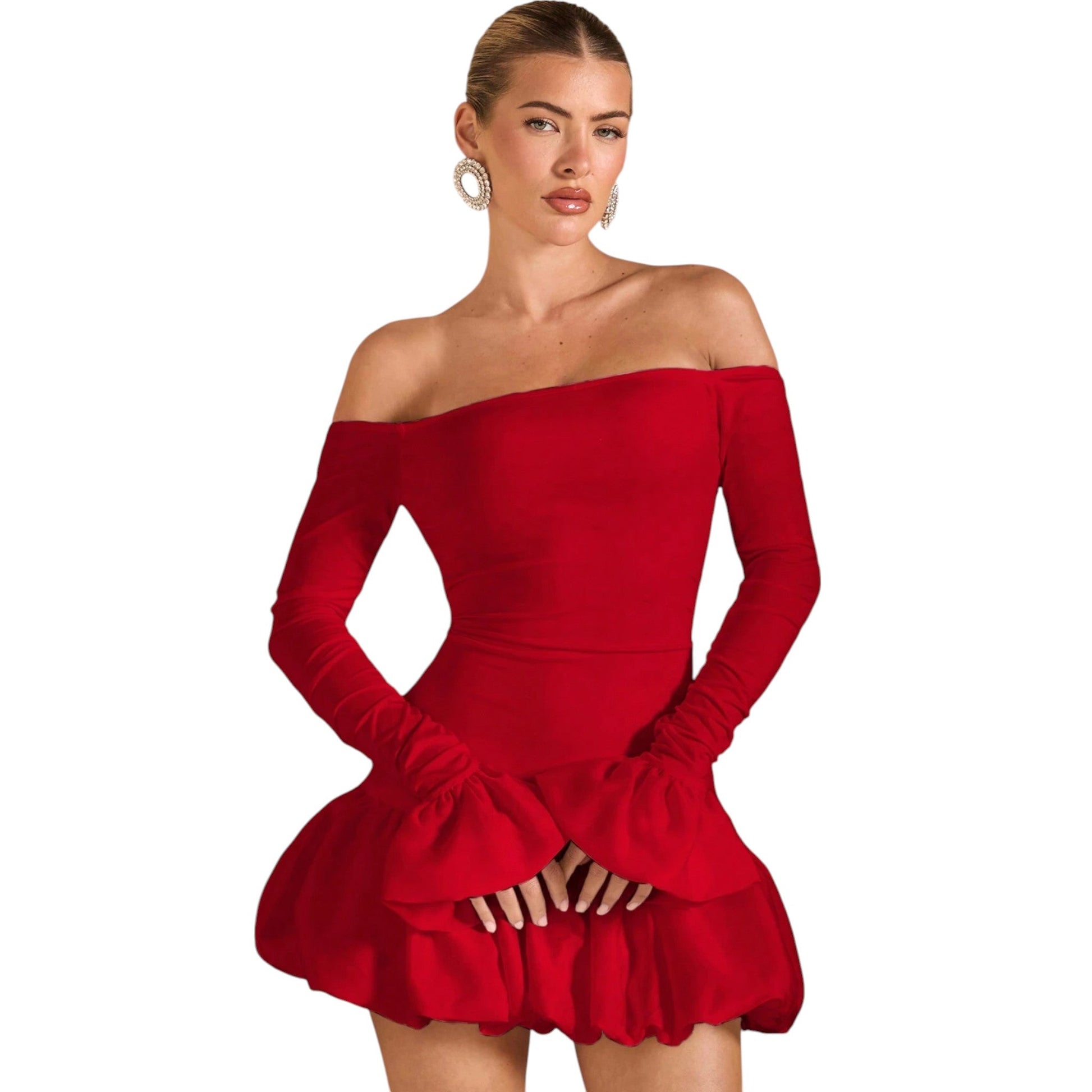 Címke nélküli, piros, ejtett vállú, hosszú ujjú, fodros alsórésszel, mini.