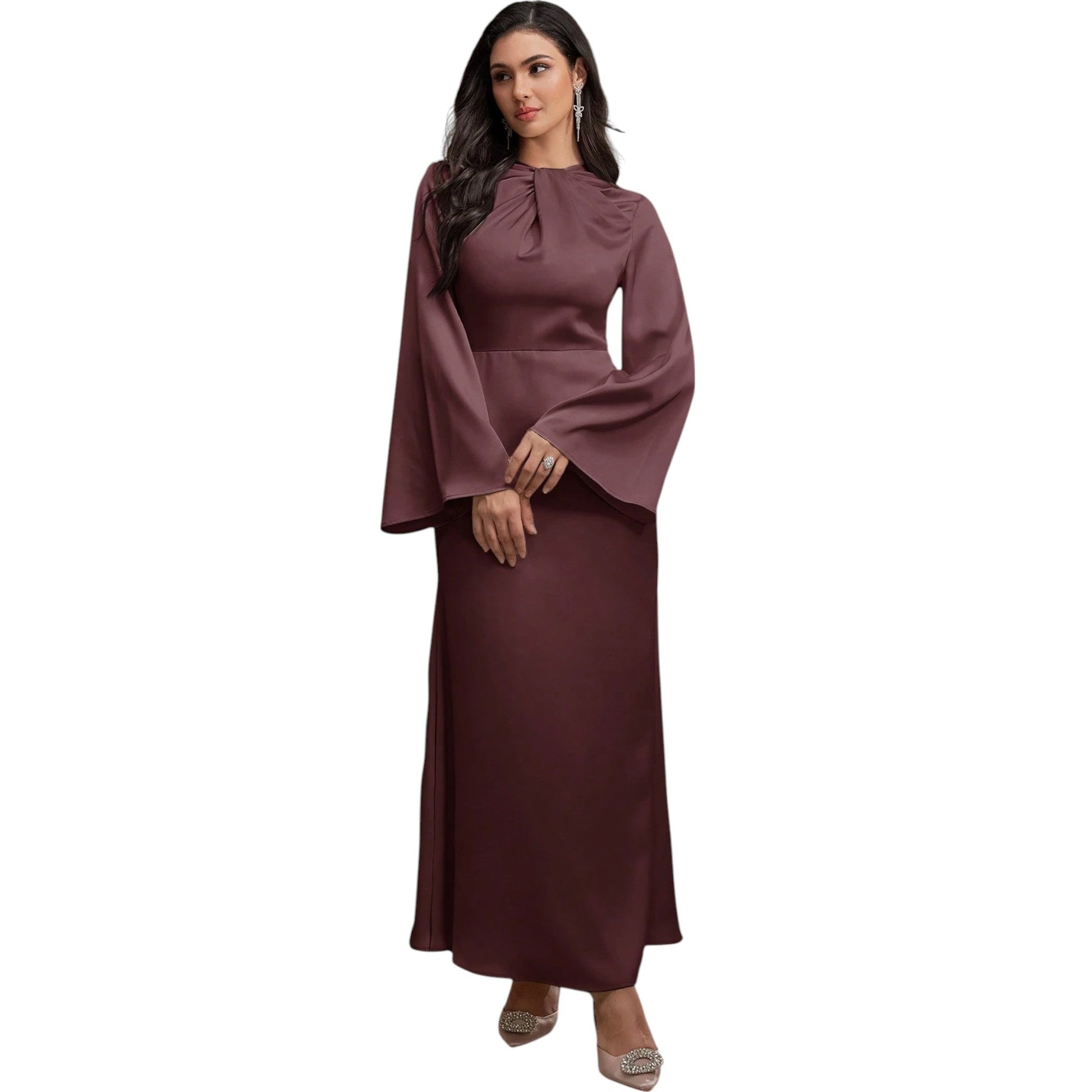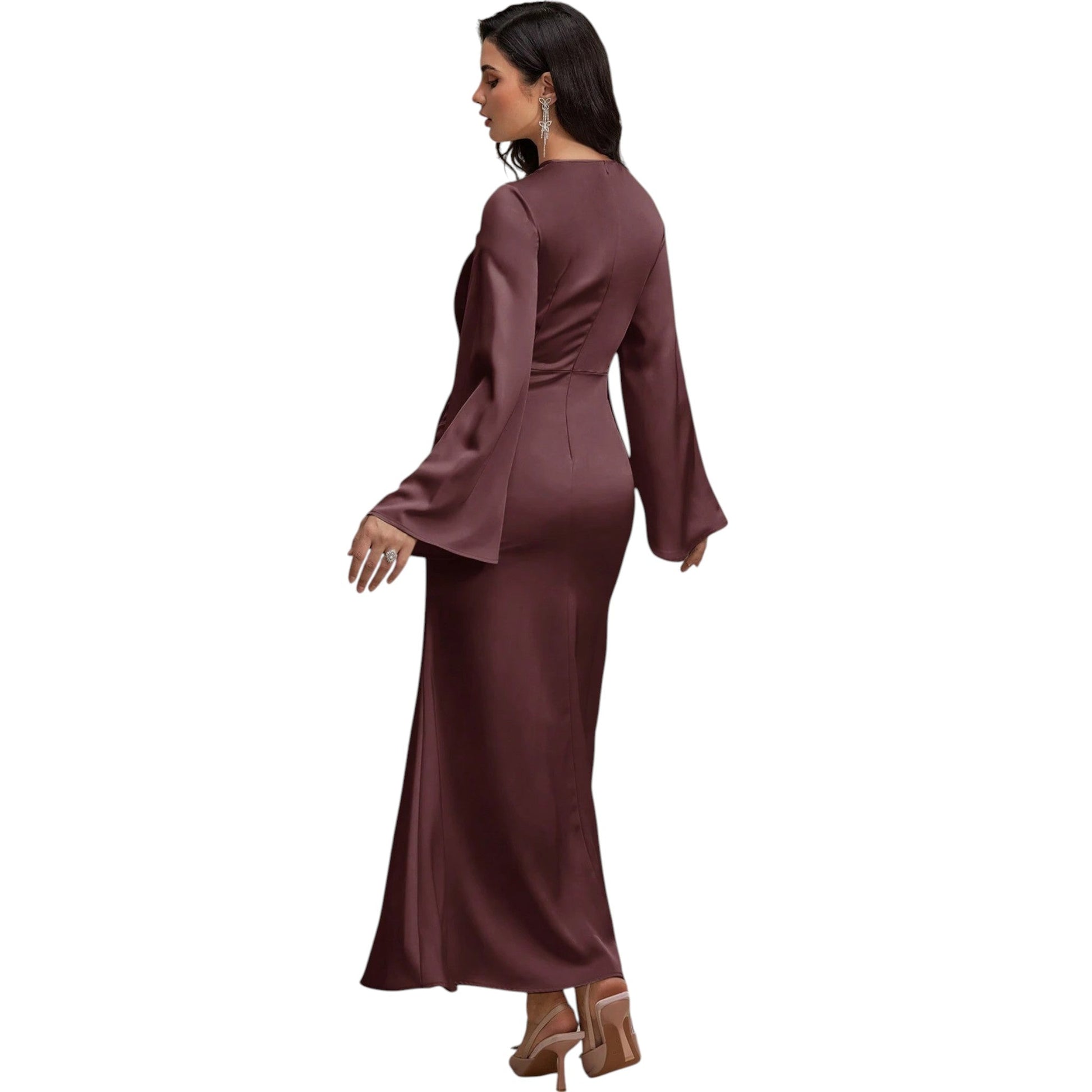 Címke nélküli, bordó, galléros, hosszú harangujjú, maxi ruha.