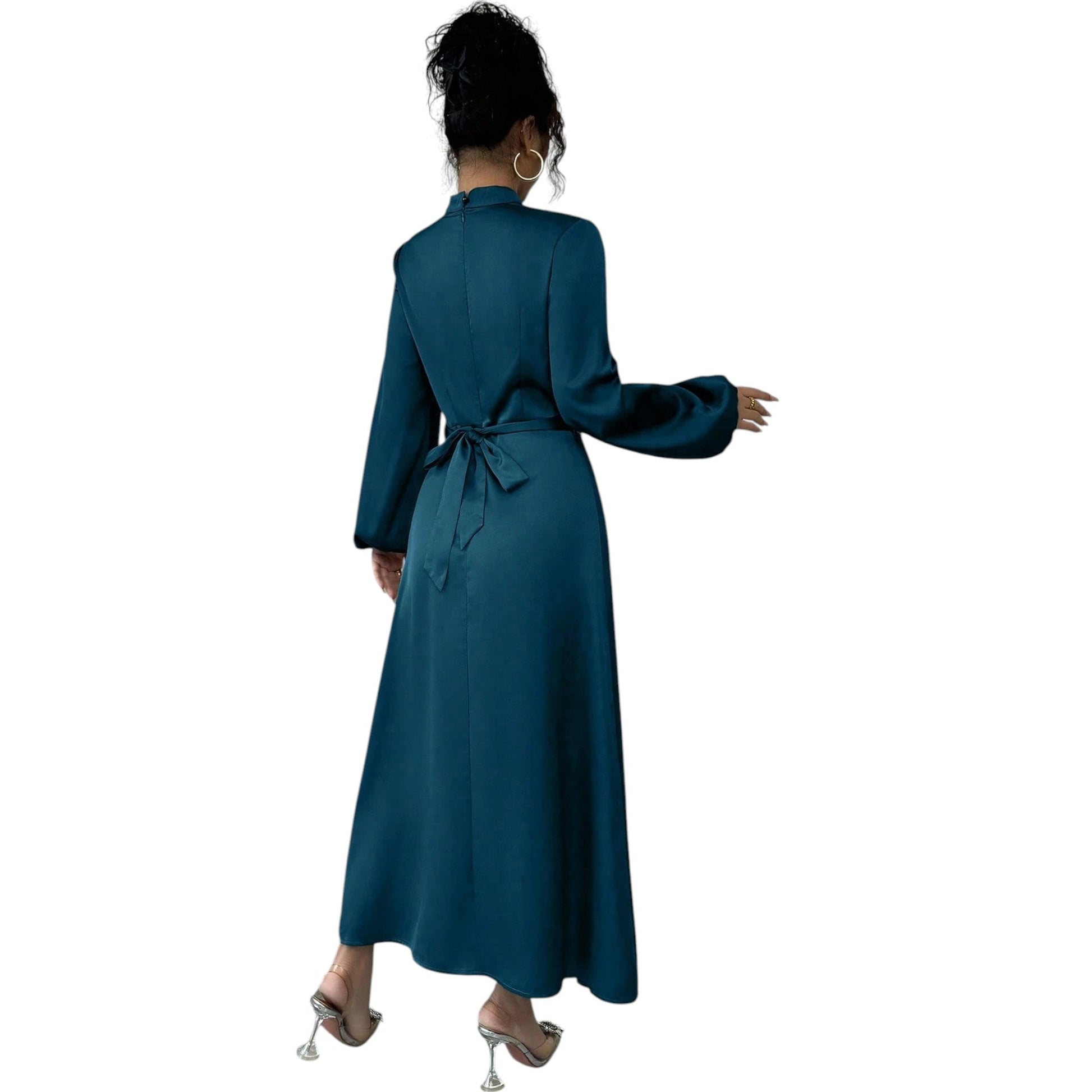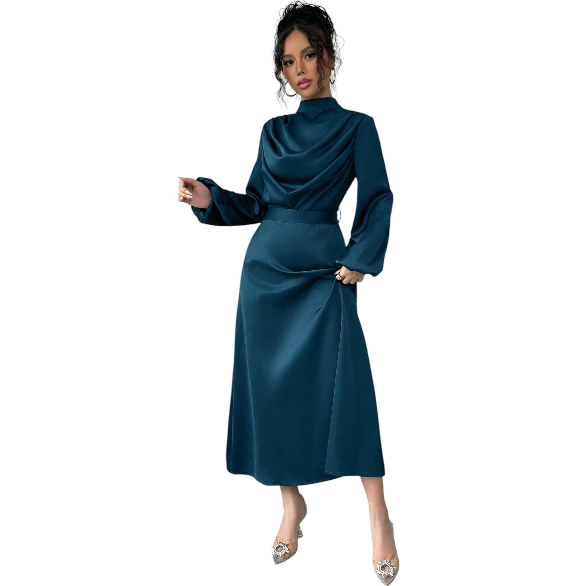 Címke nélküli, türkiz, hosszú ujjú, galléros, drappírozott, midi ruha.