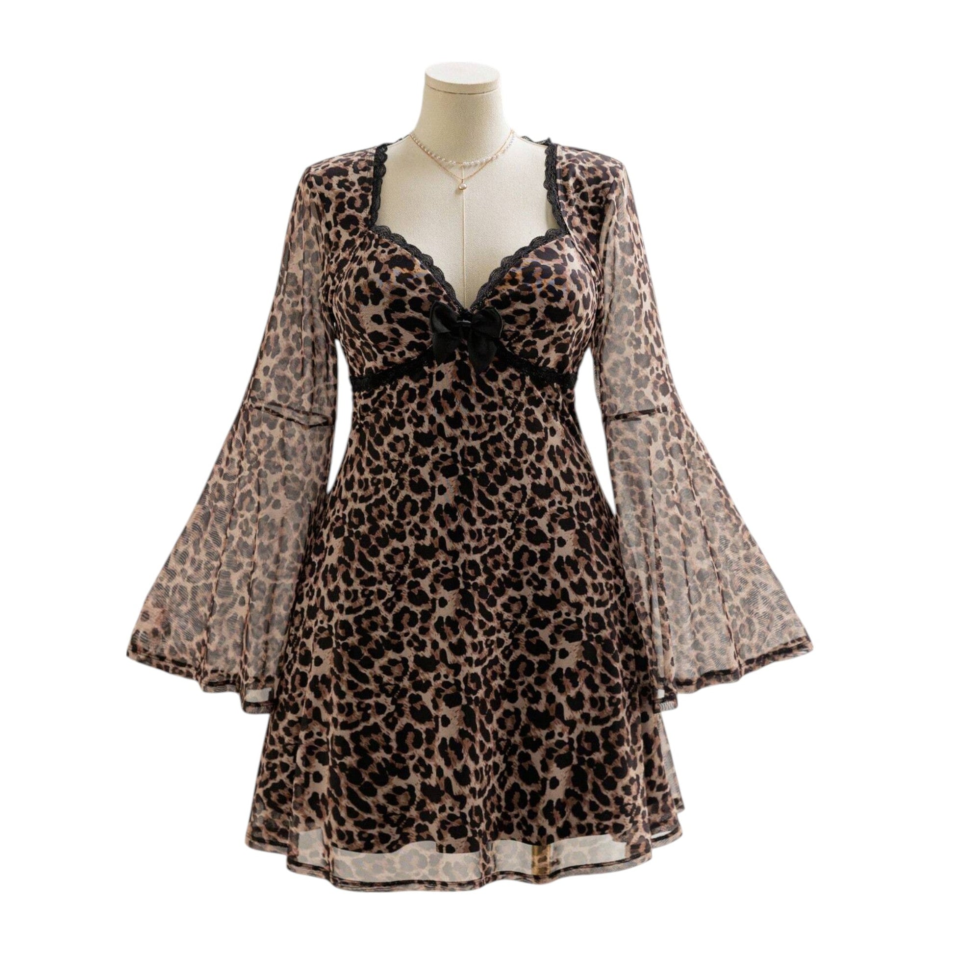 Címke nélküli, leopárdmintás, hosszú harangujjú, V-nyakú, csipkés mini ruha.