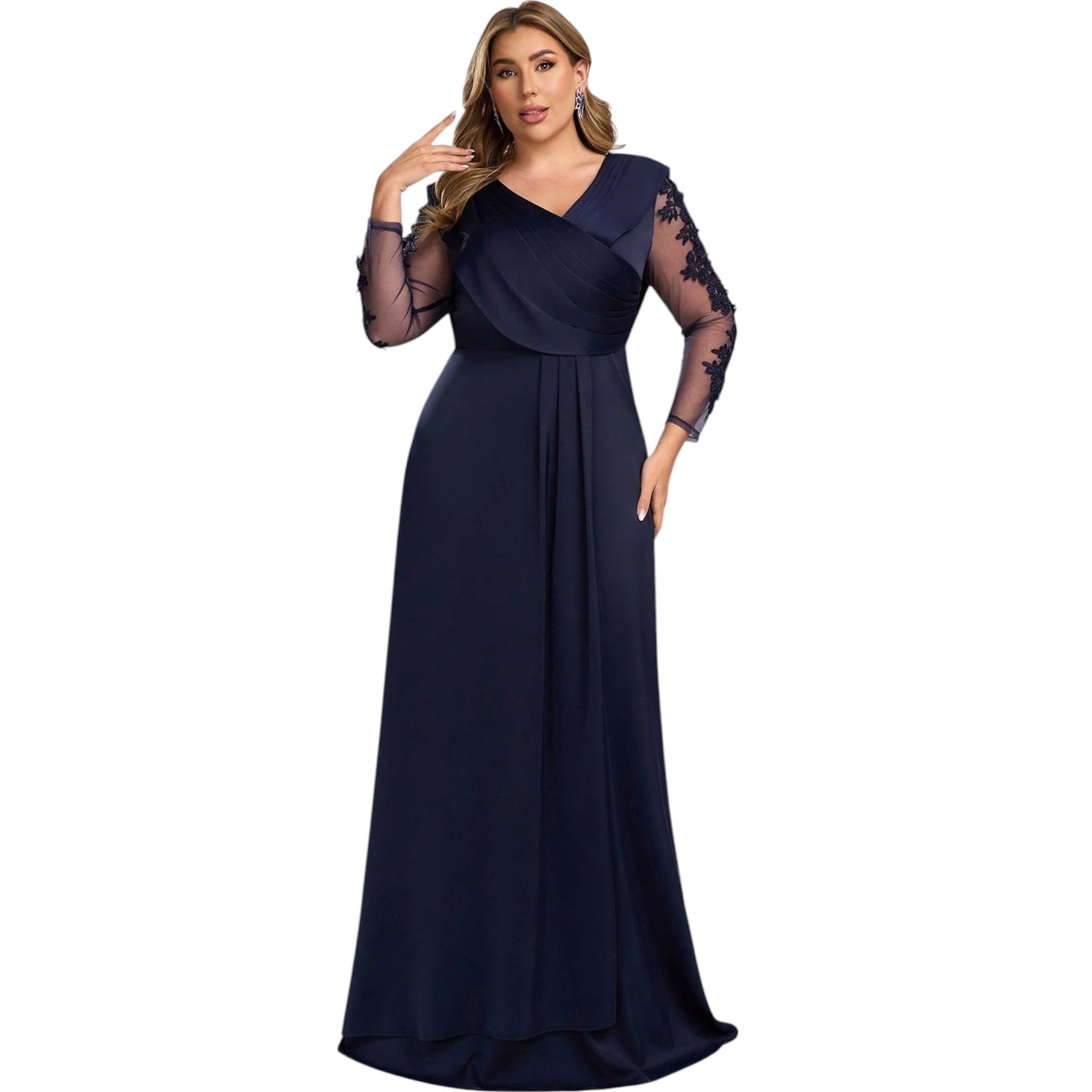 Címke nélküli, sötétkék, hosszú, V-nyakú maxi estélyi ruha, átlátszó, csipkés hosszú ujjakkal, mellrészén átlapolt díszítéssel.