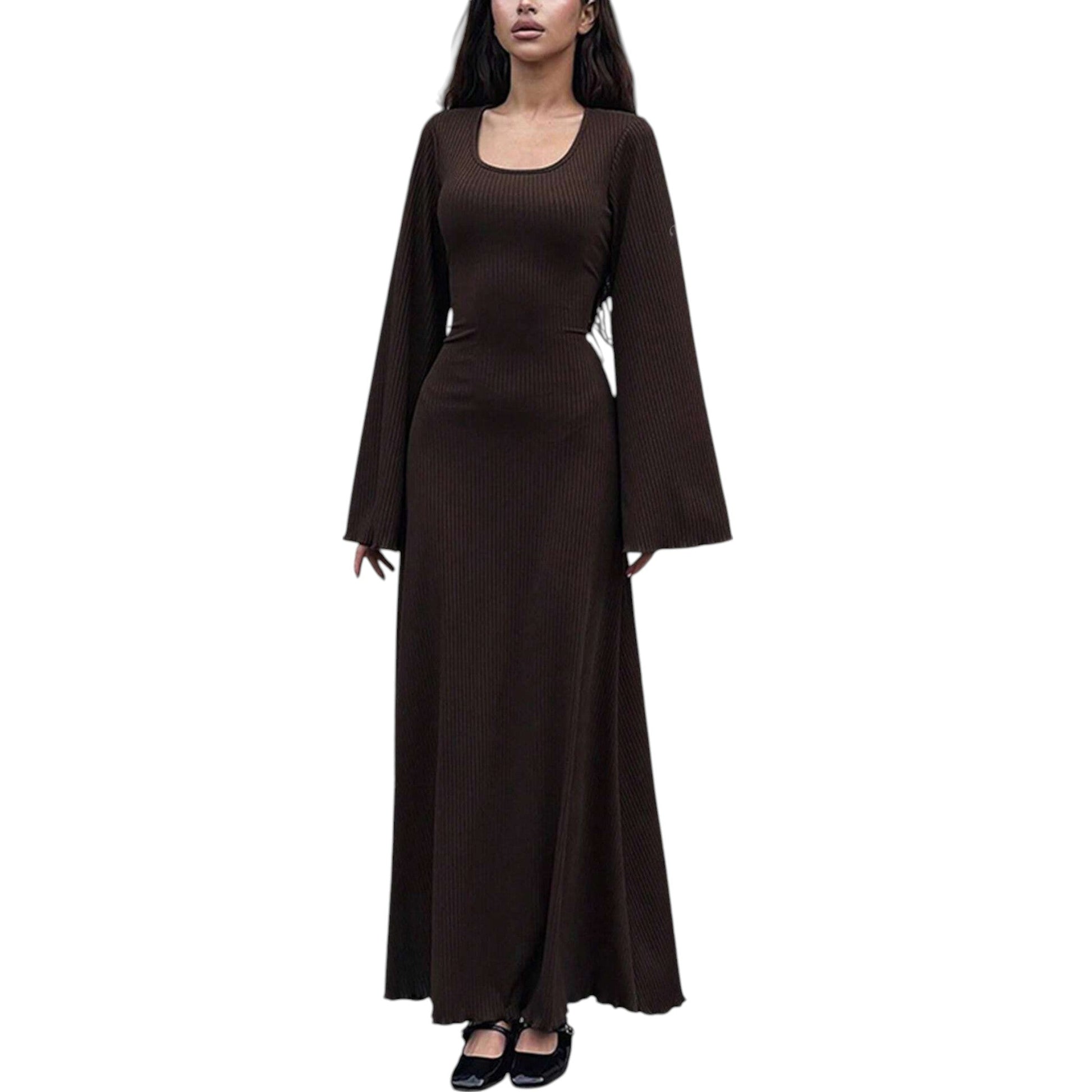 Címke nélküli, barna, négyzet nyakú, hosszú harangujjú, bordázott maxi ruha.