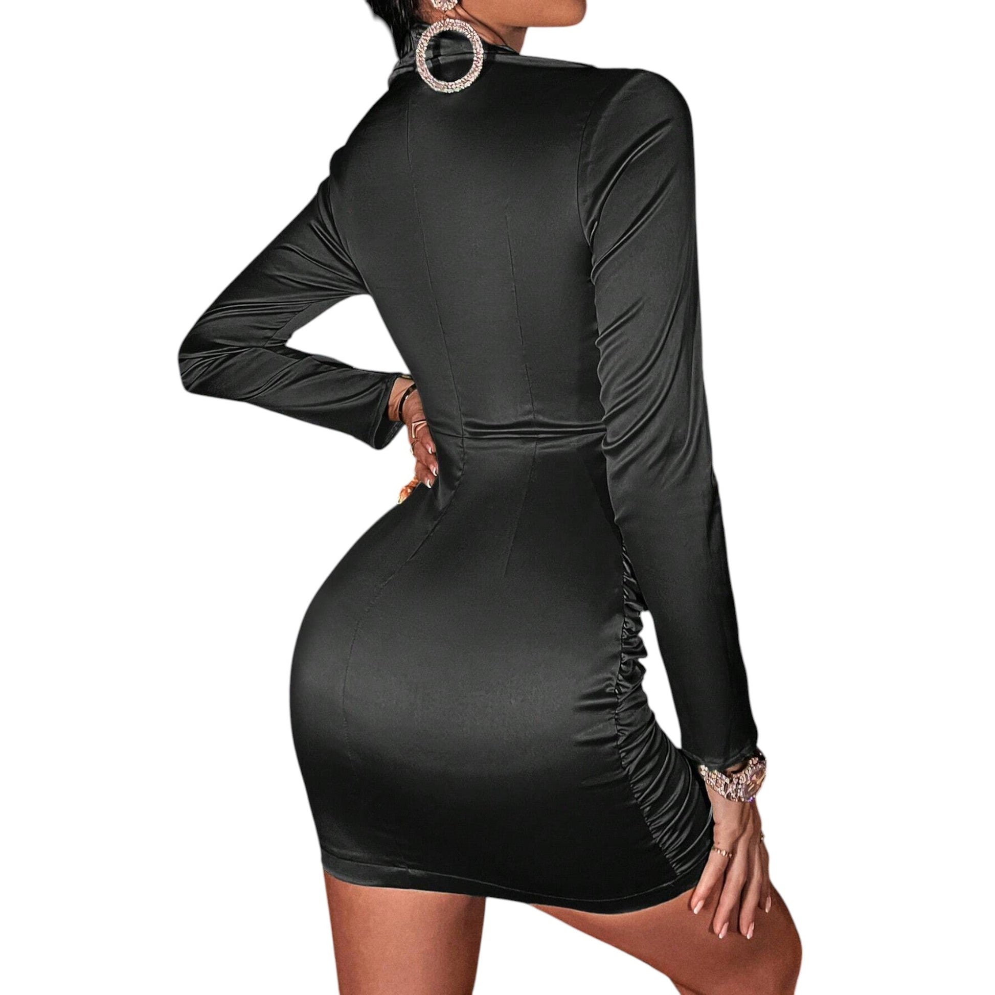 Címke nélküli, fekete, garbó nyakú, hosszú ujjú, ráncolt, slim fit mini ruha.
