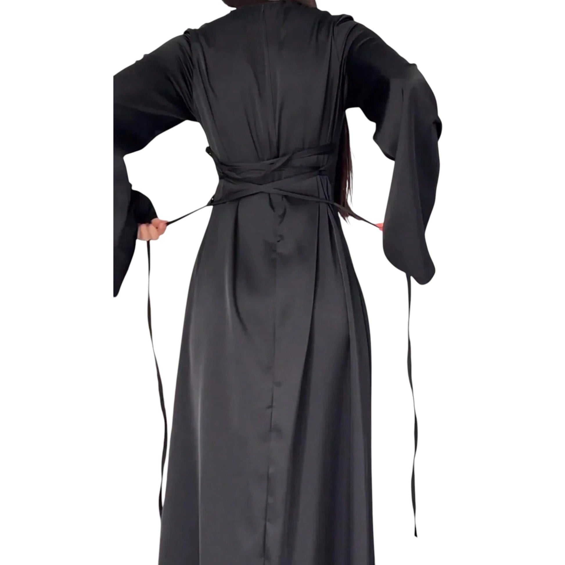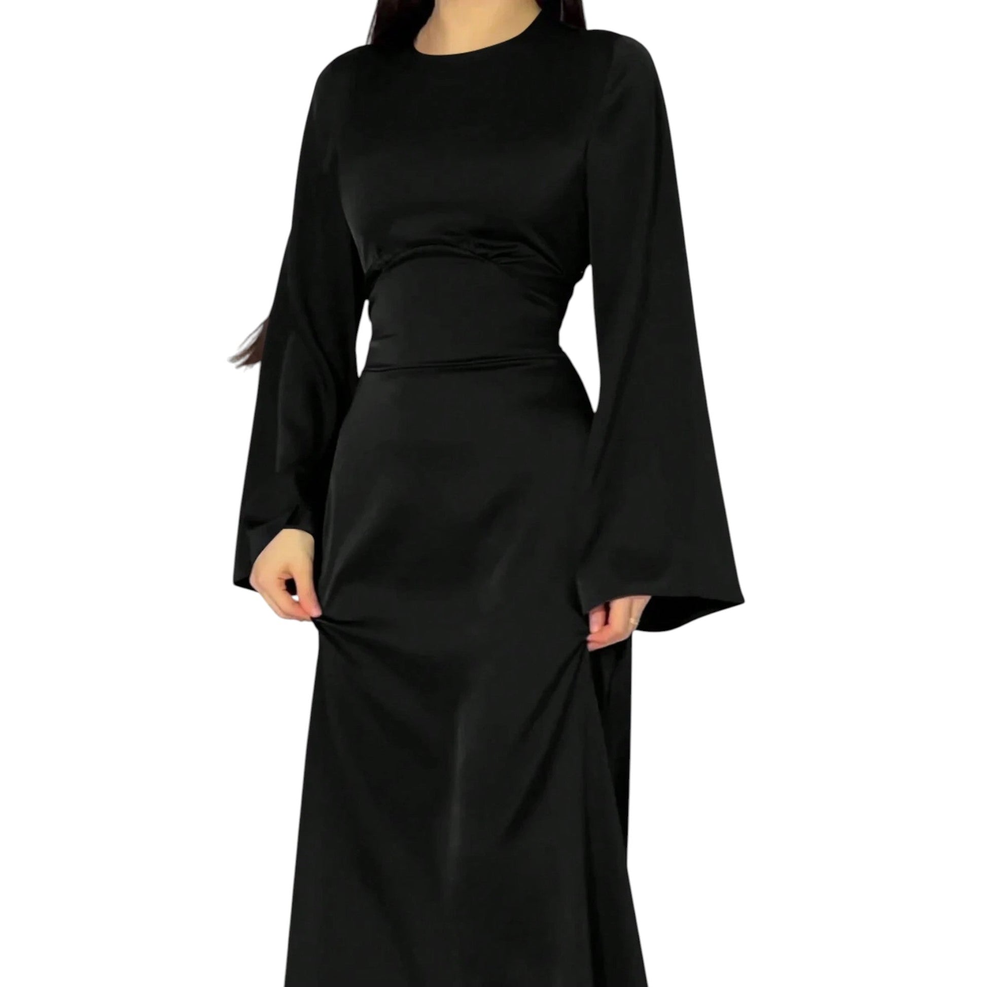 Címke nélküli, fekete, hosszú, bővülő ujjú, kerek nyakú, maxi ruha, derékban szűkített.