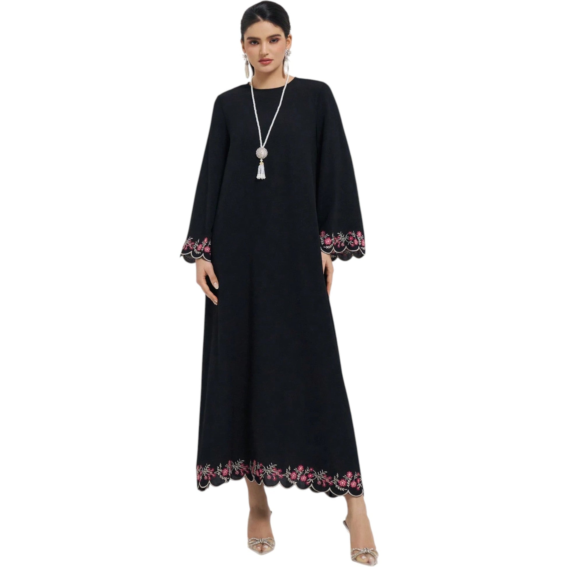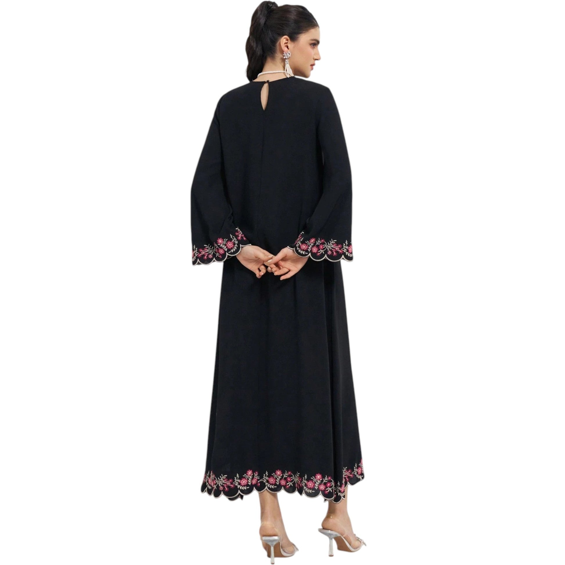 Címke nélküli, fekete, hosszú ujjú, kerek nyakú, hímzett virágmintával az ujjakon és a ruha alján, scalloped szegély az ujjakon és a ruha alján, földig érő hossz.
