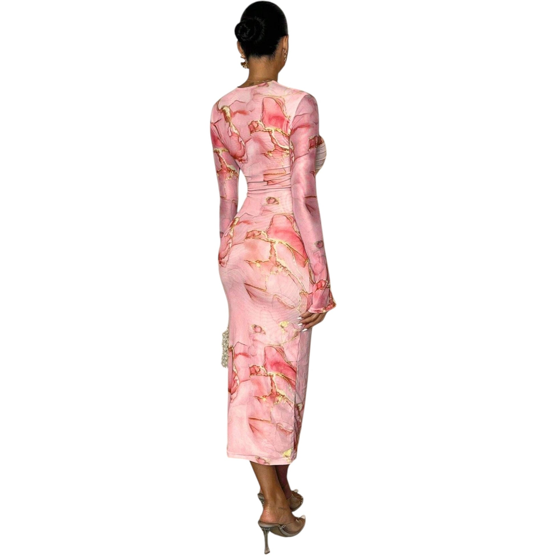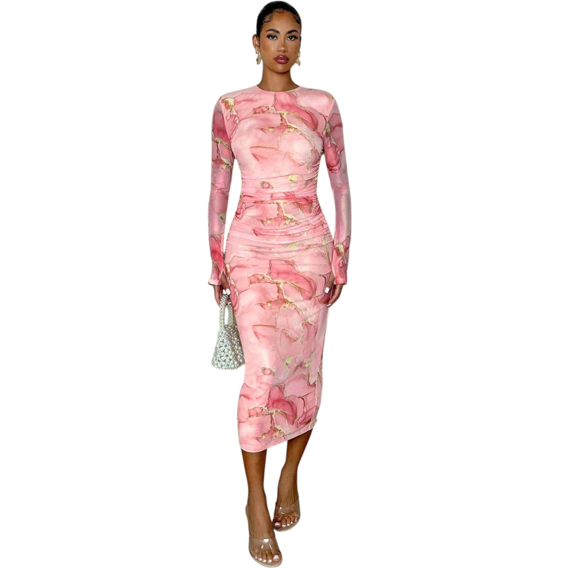 Címke nélküli, rózsaszín, mintás, hosszú ujjú, testhezálló, ráncolt midi ruha.