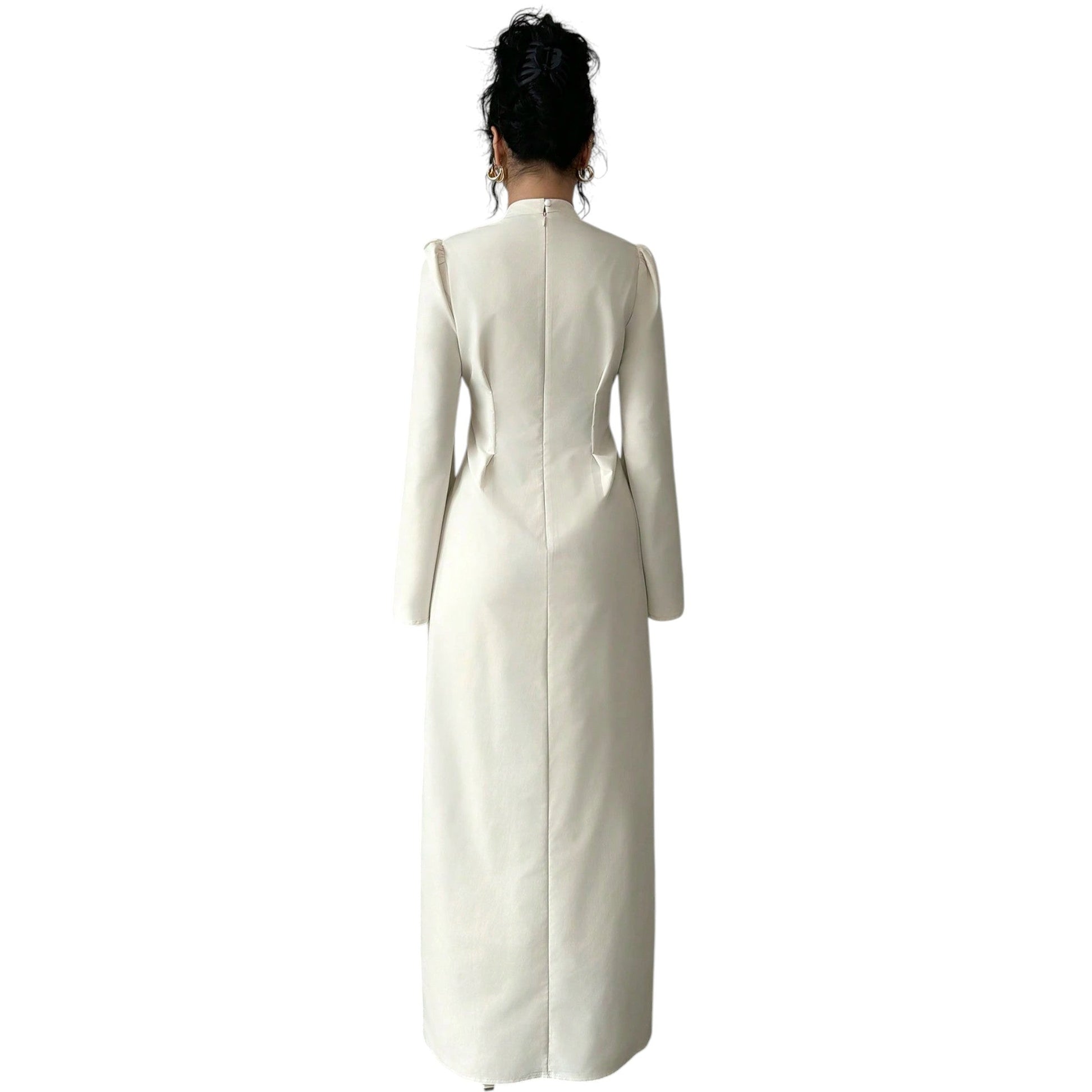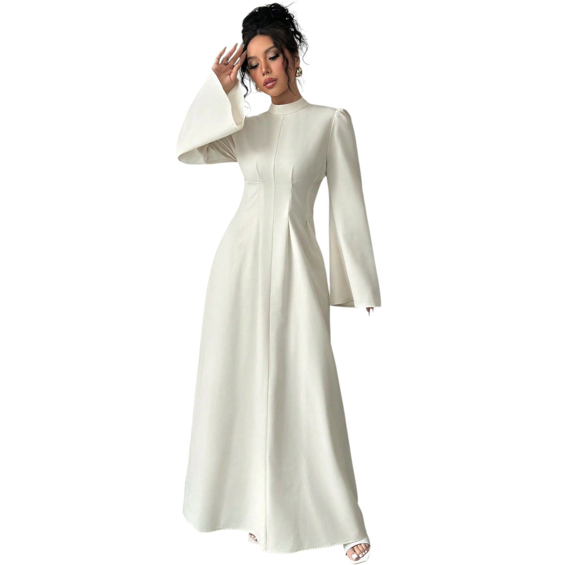 Címke nélküli, ekrü, magas nyakú, hosszú harangujjú, hosszú, bő szoknyás ruha.
