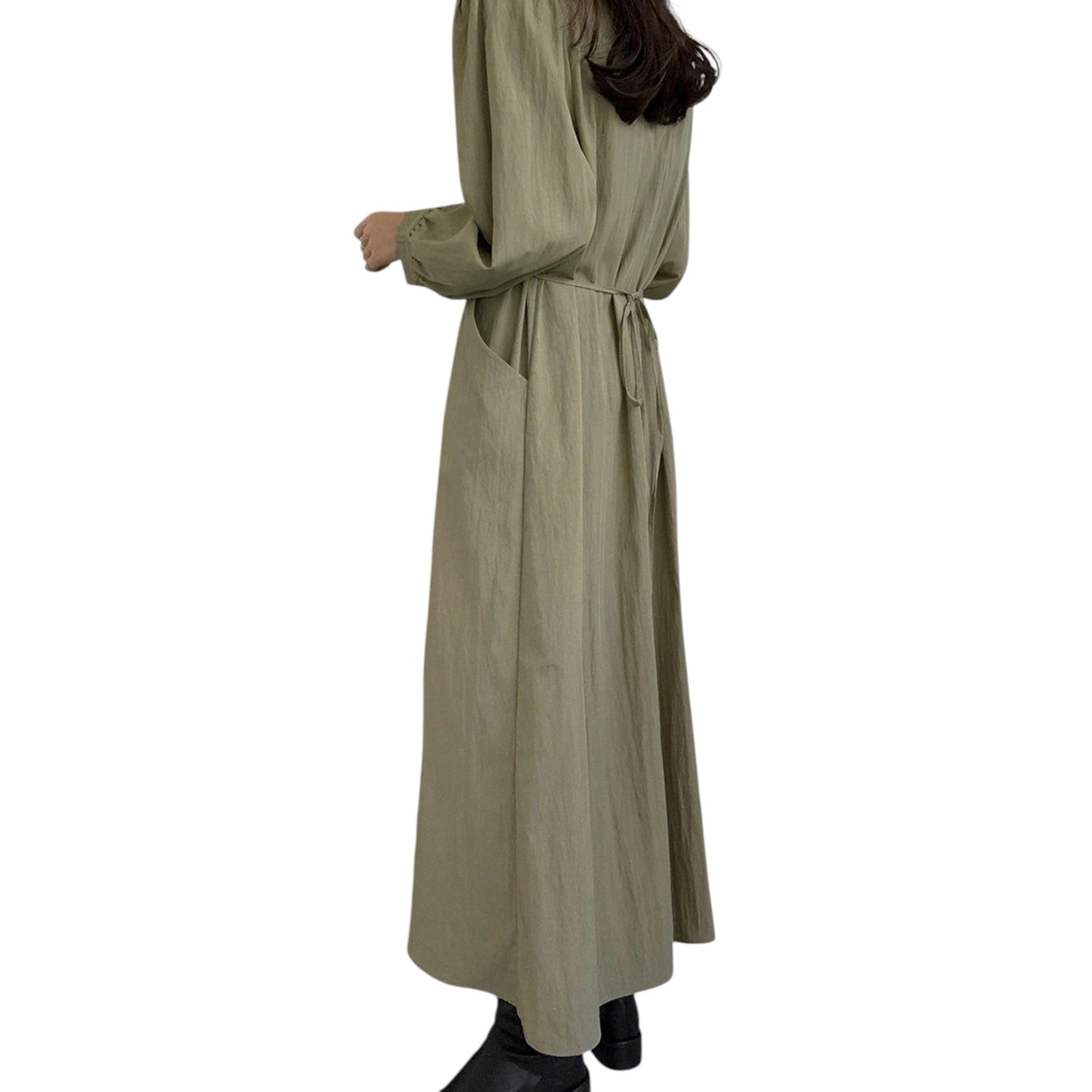 Címke nélküli, zöld, hosszú ujjú, V-nyakú, galléros, elől hajtásokkal és ráncolással, oldalt zsebek, földig érő hosszúság.