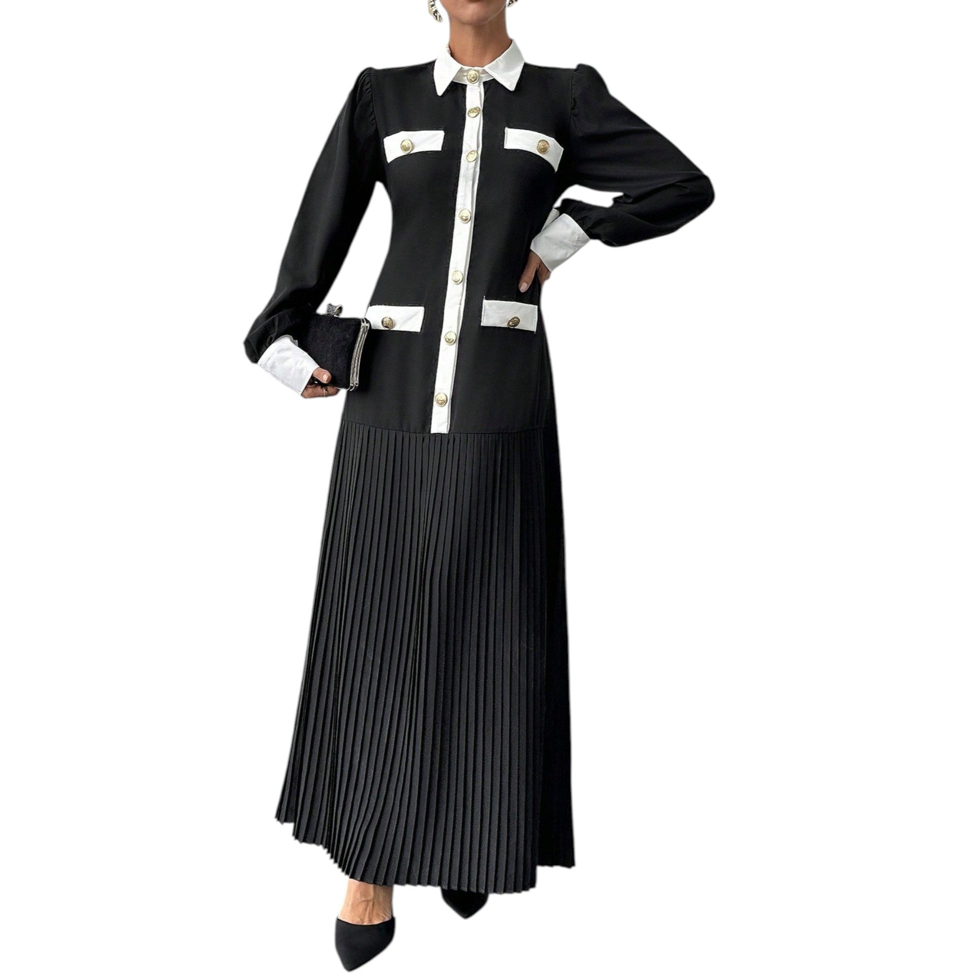 Címke nélküli, fekete és fehér, inggallérral, hosszú ujjú, elöl gombos, pliszírozott szoknyájú, maxi hosszúságú.