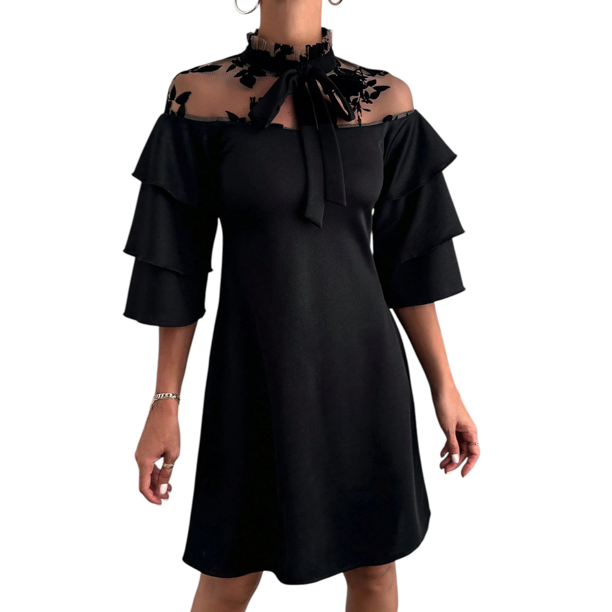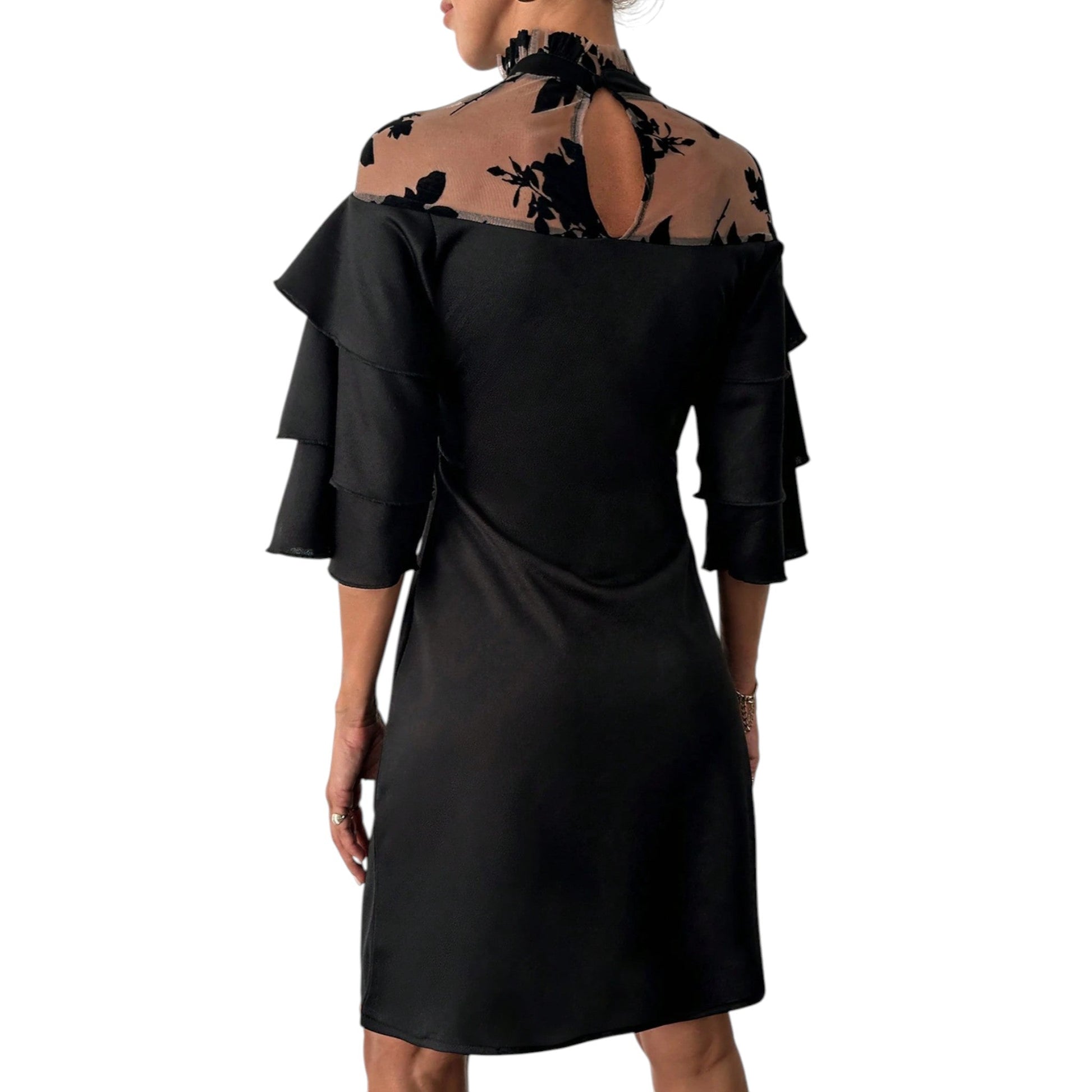 Címke nélküli, fekete, tüllös, magas nyakú, masnis, rövid fodros ujjú, A vonalú, mini ruha.
