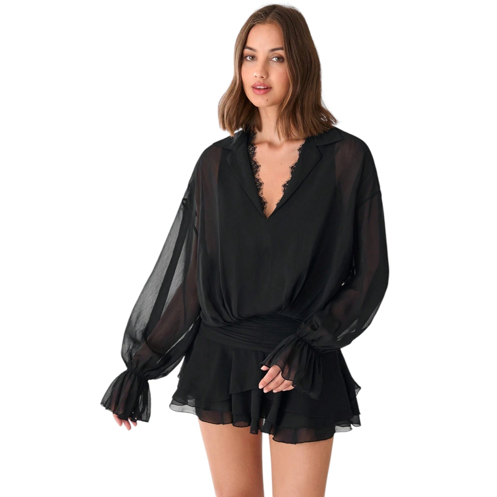 Címke nélküli, fekete, mély V-nyakú, galléros, csipkés díszítésű, áttetsző hosszú ujjú blúz fodros mandzsettával, fodros szélű rövidnadrág.