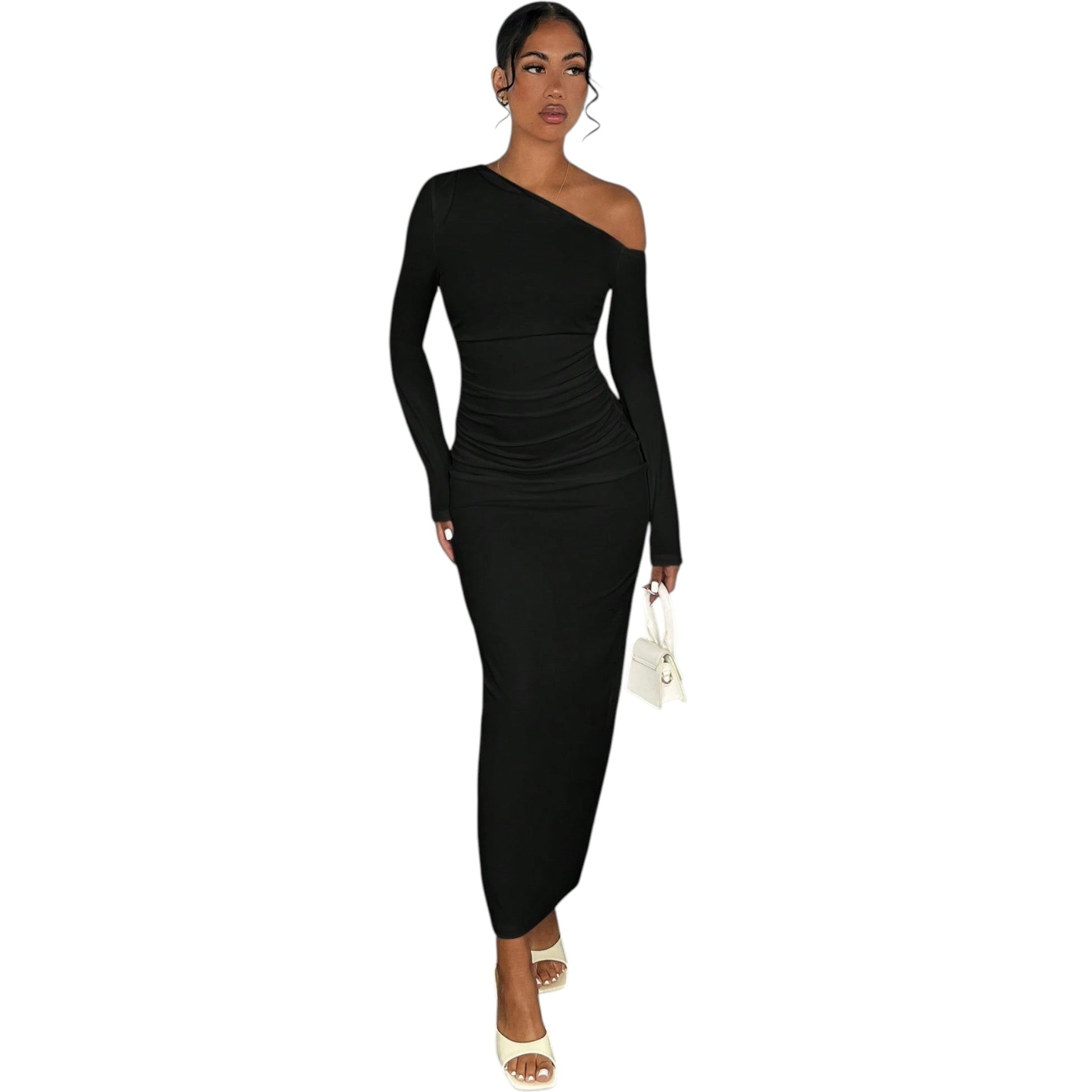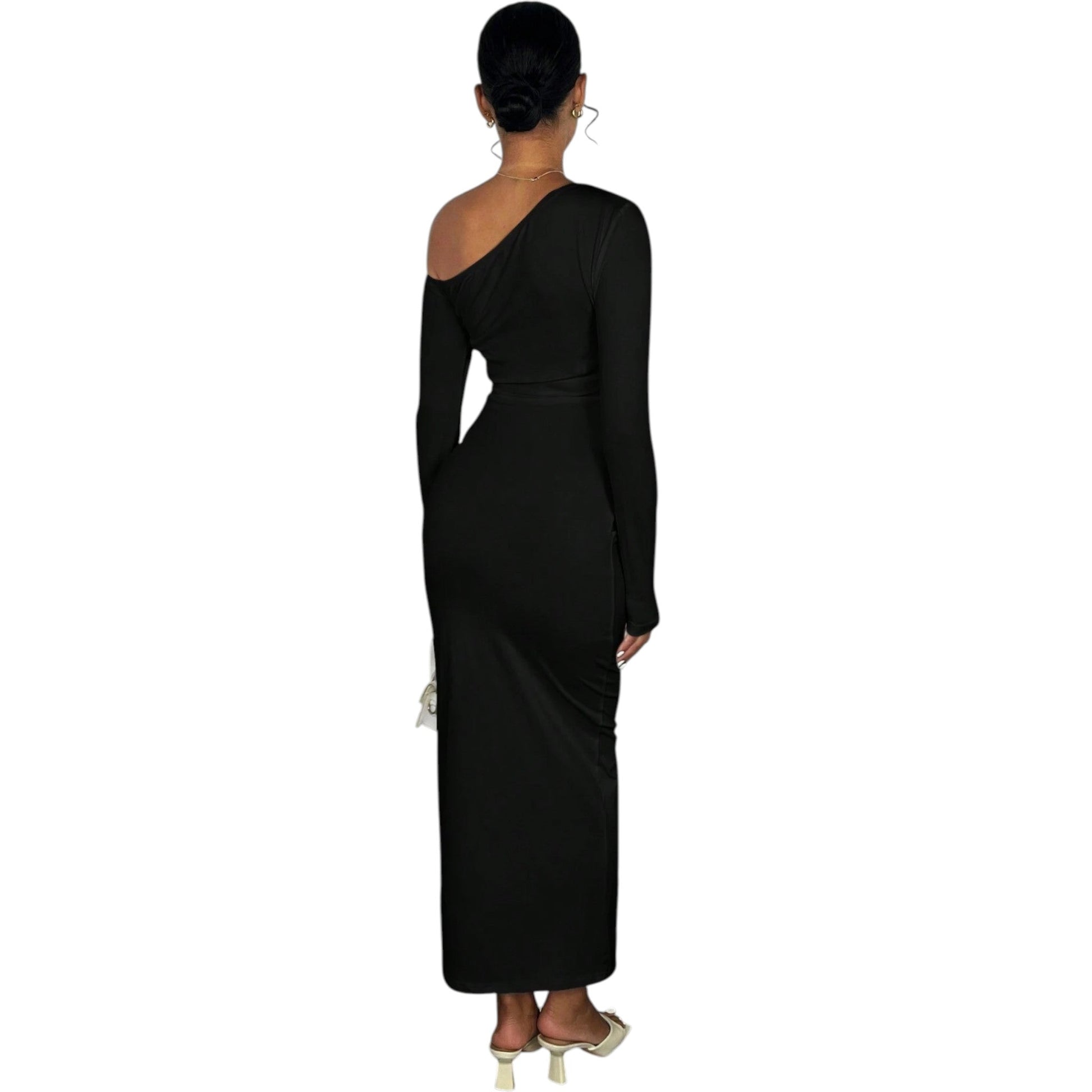 Címke nélküli, fekete, egyvállas, hosszú ujjú, ruched oldalsó rész, maxi hosszúságú.