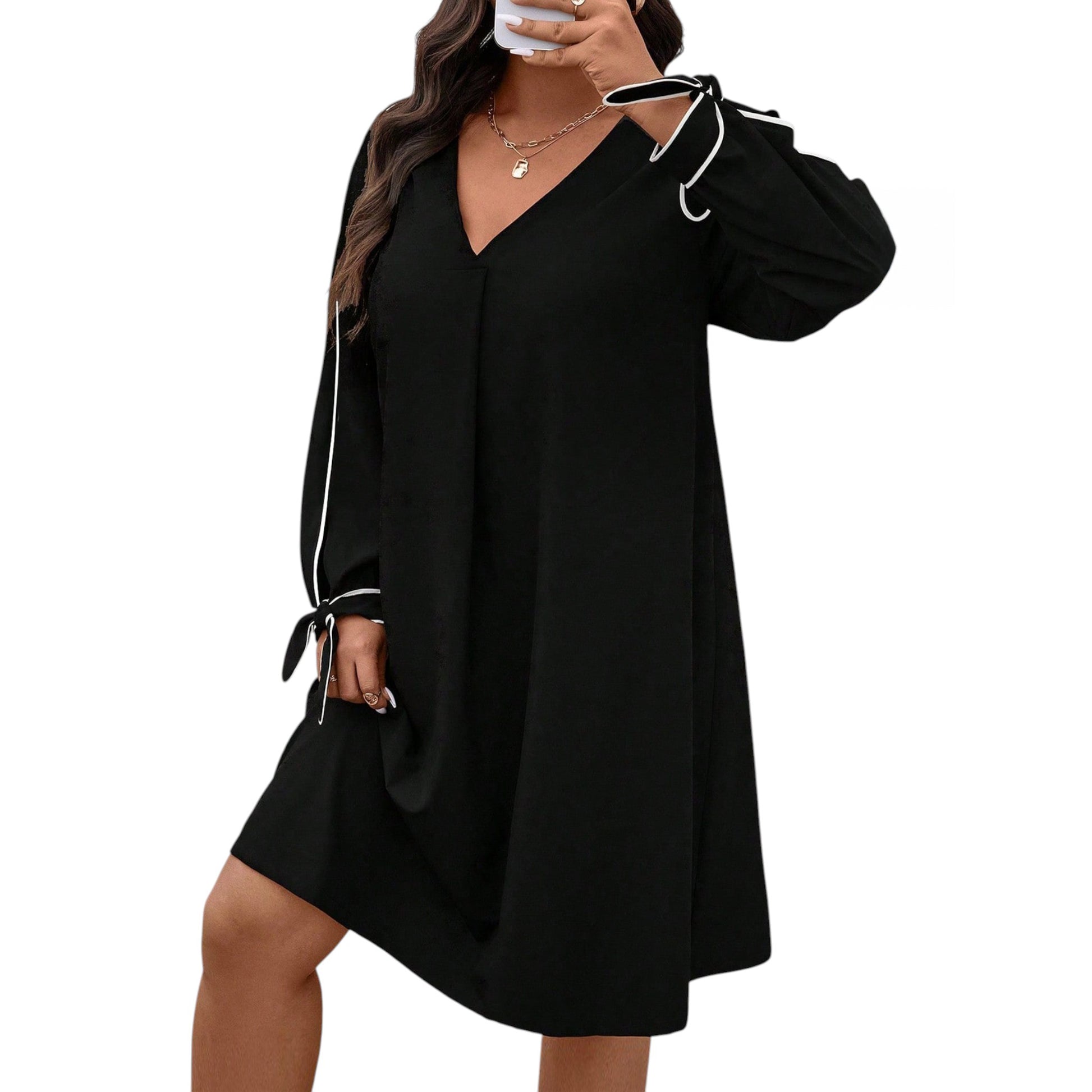 Címke nélküli, fekete, V-nyakú, hosszú ujjú, bő szabású mini ruha, fehér szegélyekkel és az ujjakon megkötős részlettel.