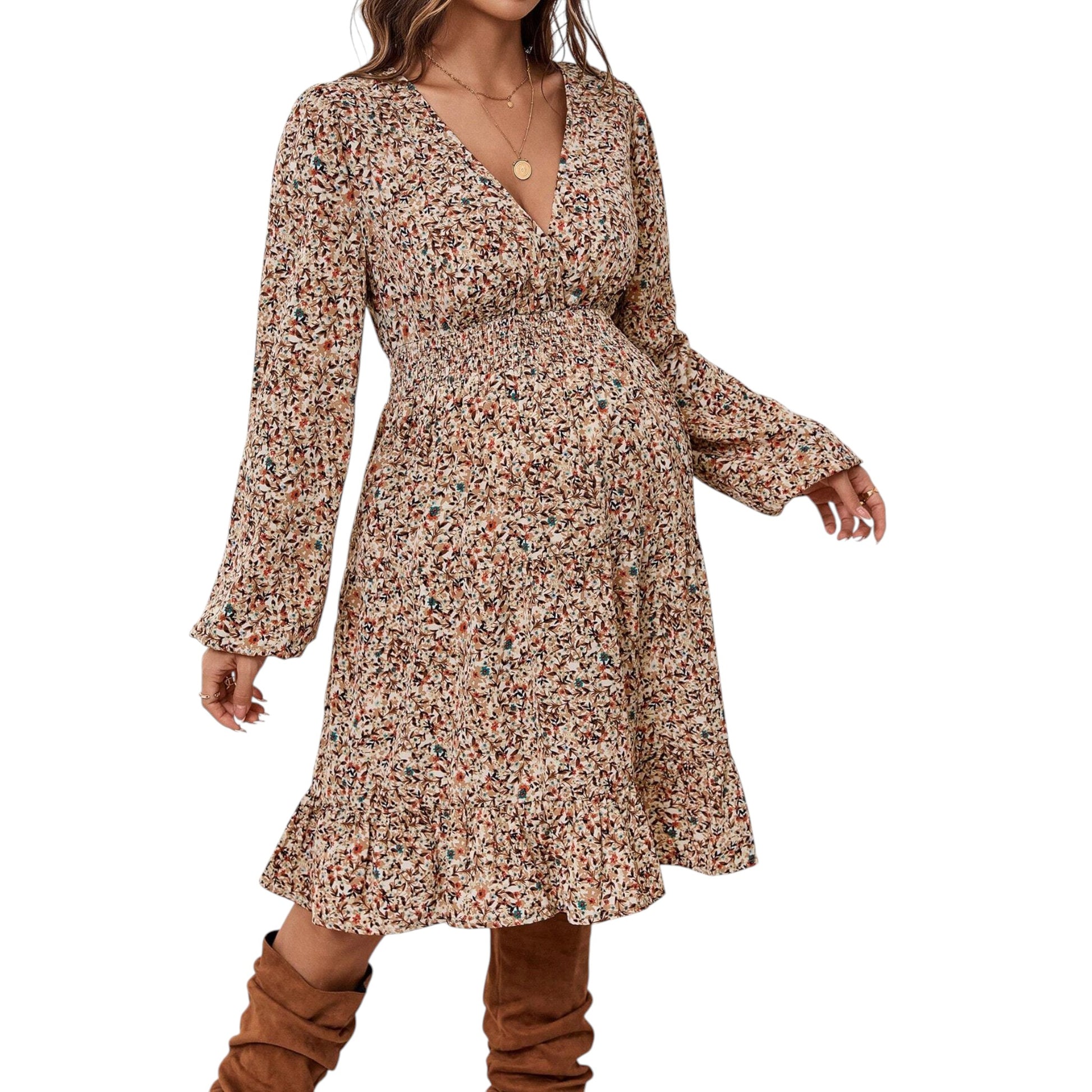Címke nélküli, drapp, mintás, V-nyakú, hosszú ujjú, gumis derekú, fodros, mini ruha.
