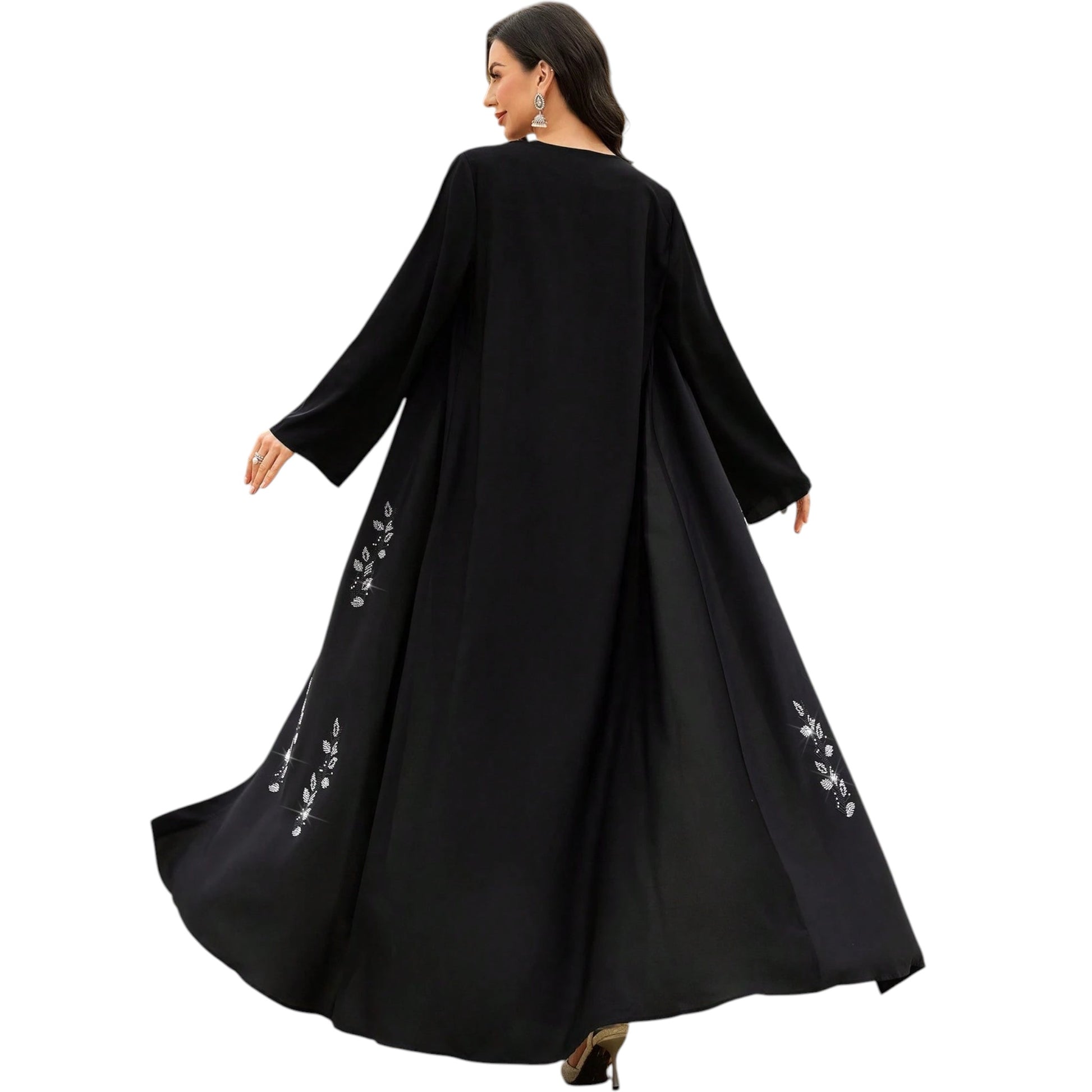 Címke nélküli, fekete, hosszú ujjú, nyitott abaya, hímzett mintával.