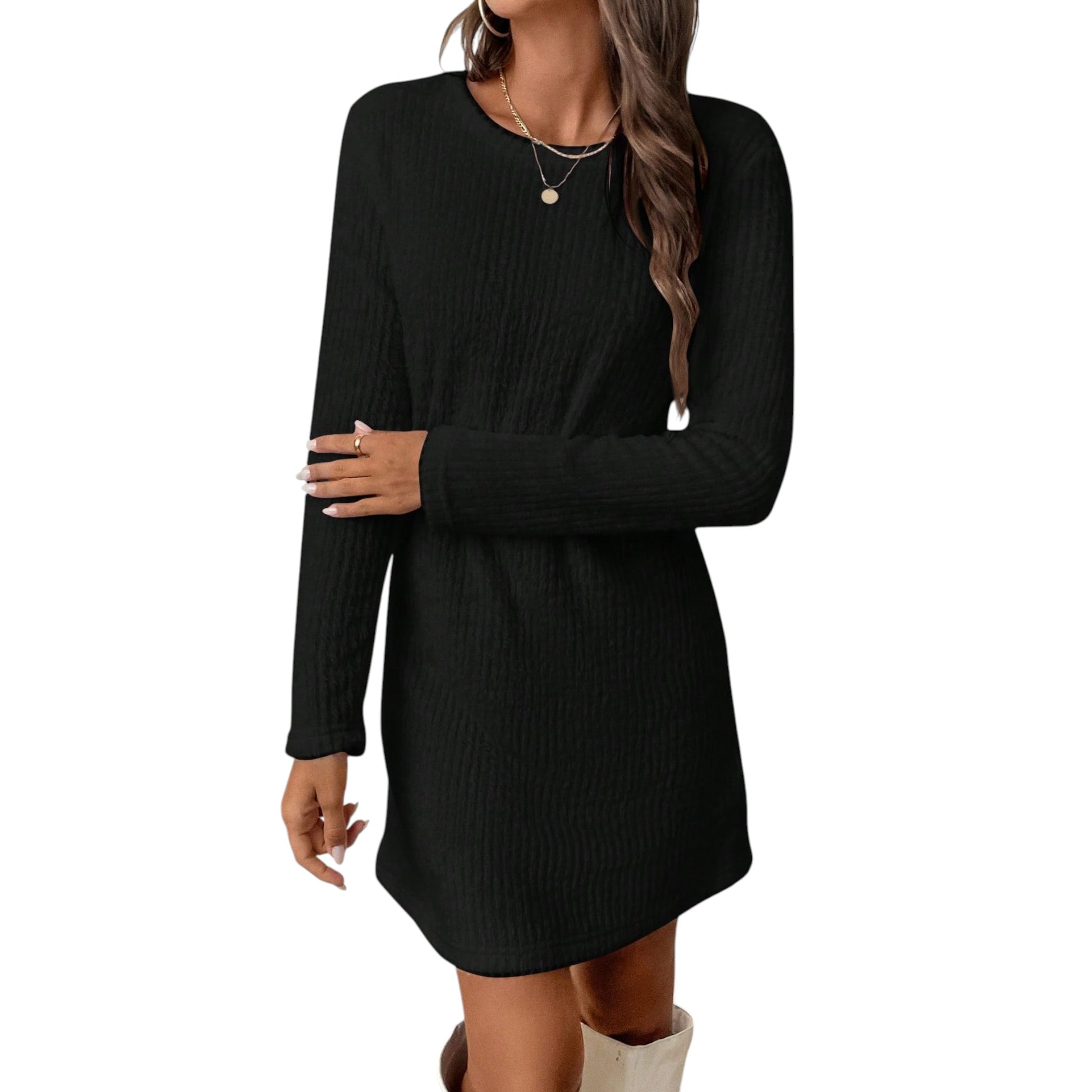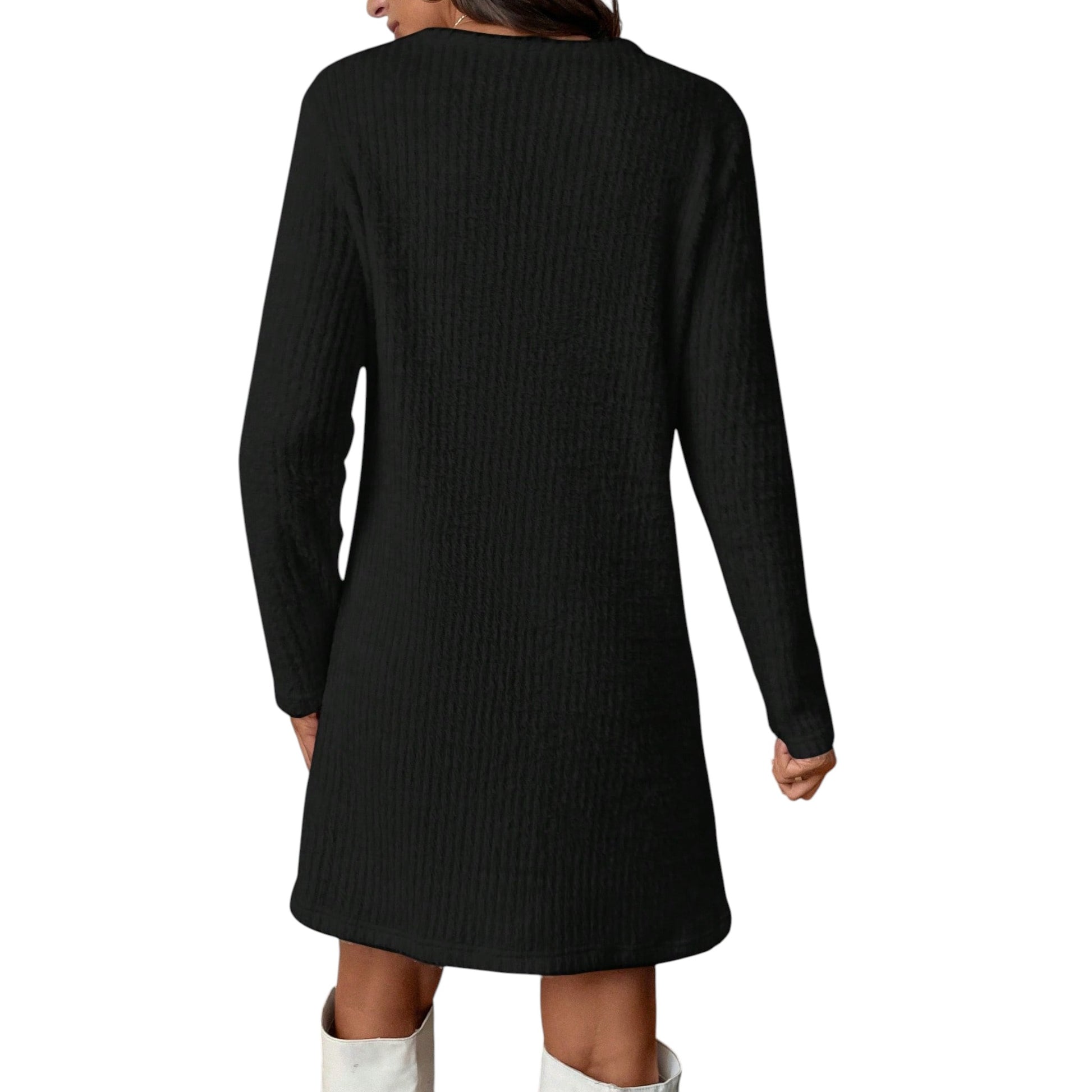 Címke nélküli, fekete, hosszú ujjú, kötött mini ruha, kerek nyakkal és aszimmetrikus aljjal.