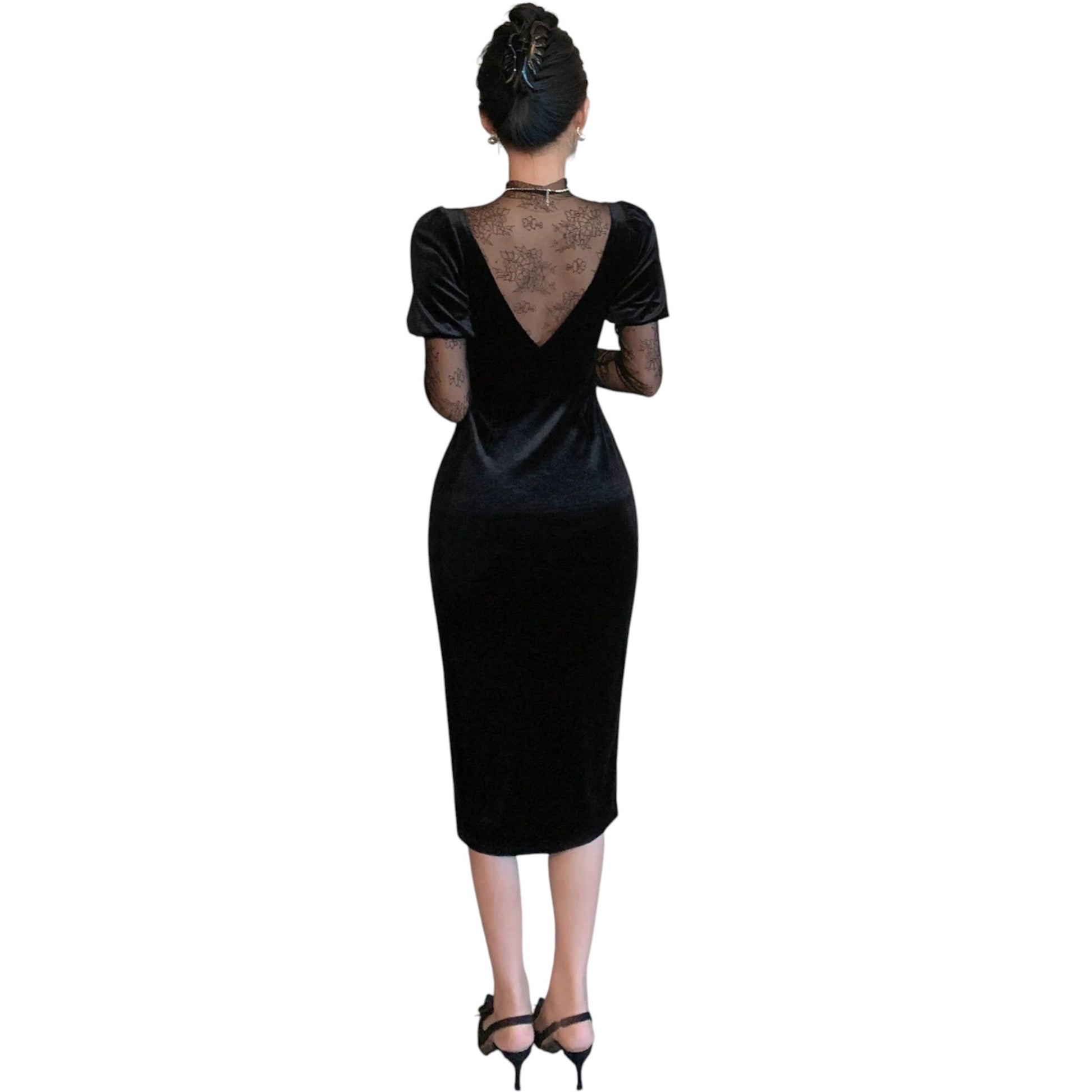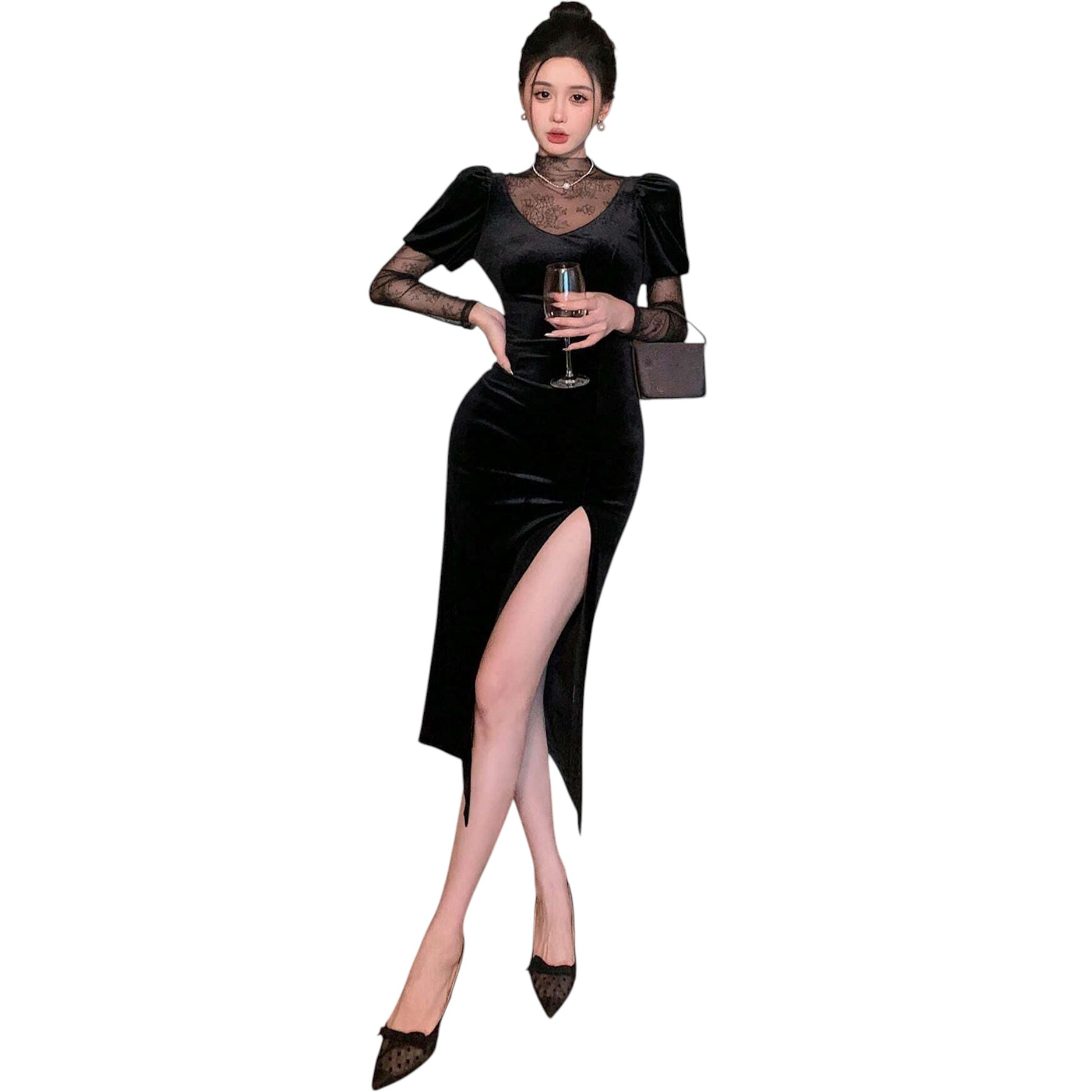 Címke nélküli, fekete, bársony, magas nyakú, hálós, puffos ujjú, oldalt felsliccelt, midi ruha.
