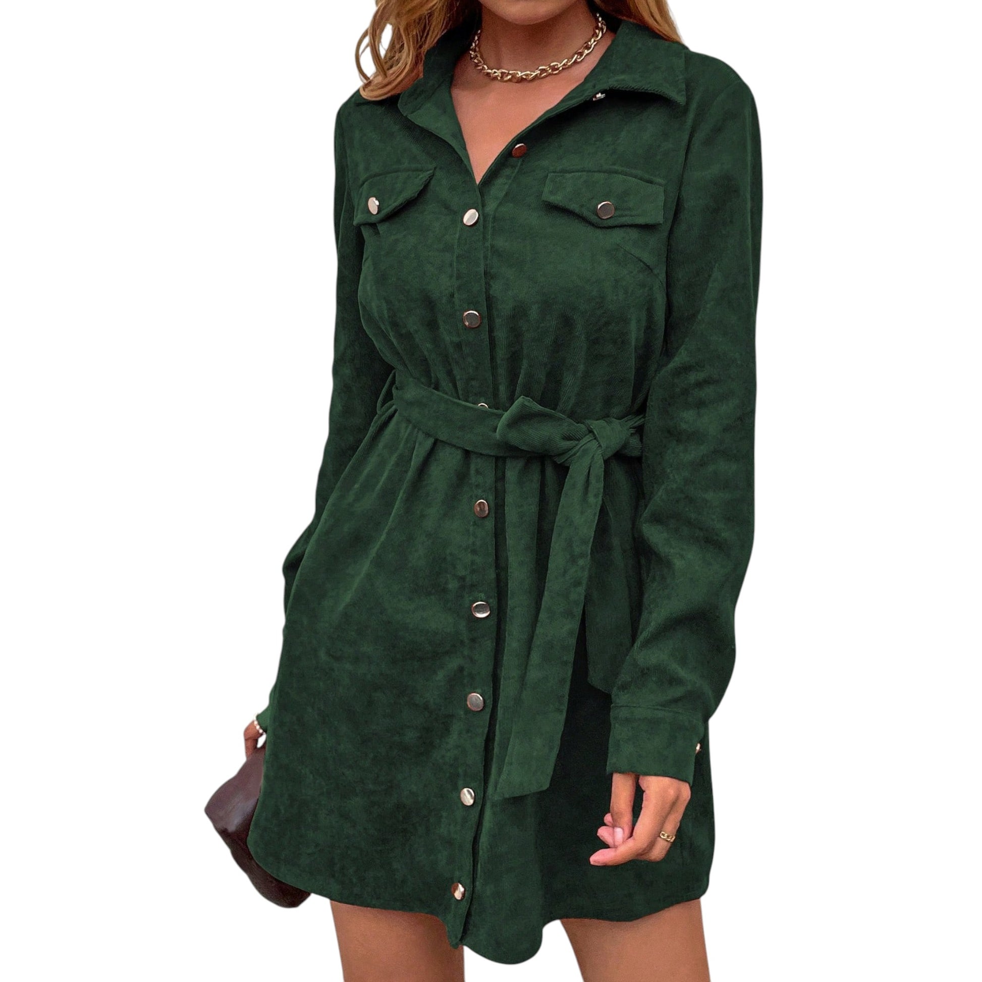 Címke nélküli, smaragdzöld, hosszú ujjú, gombos, galléros, övvel díszített, ing stílusú miniruha.