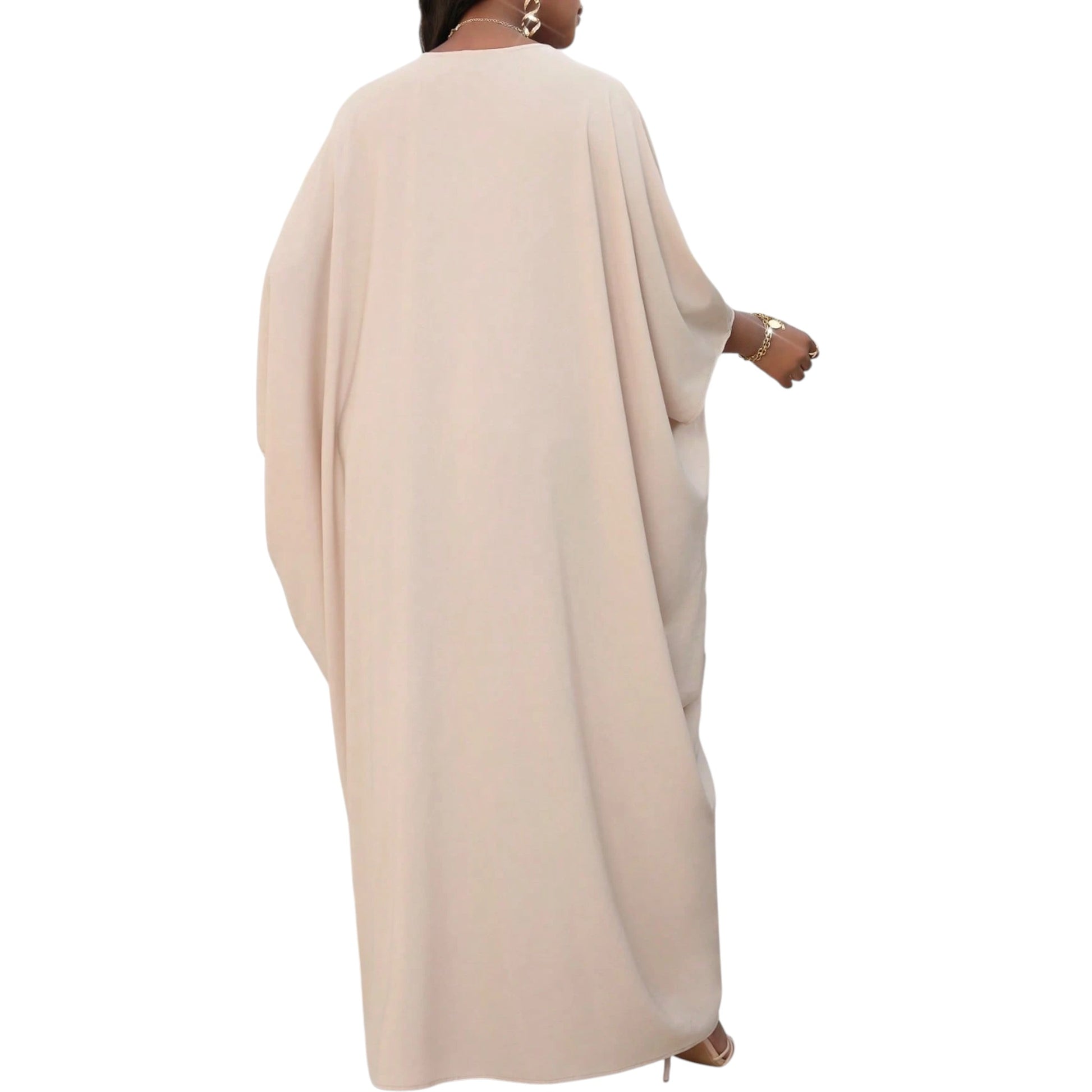 Címke nélküli, bézs, V-nyakú, denevér ujjú, bő szabású maxi ruha, fémgyűrűs díszítéssel a mellrésznél.