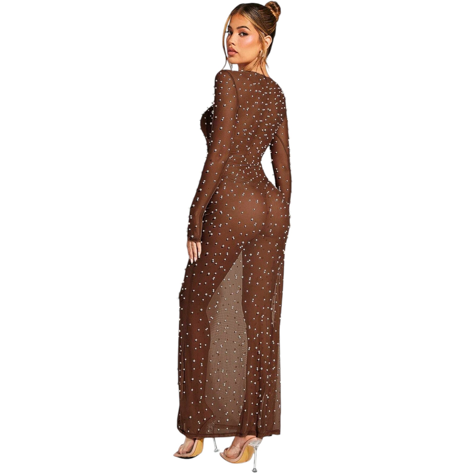 Címke nélküli, barna, áttetsző, gyöngyös díszítésű, hosszú ujjú, kerek nyakú, maxi ruha.