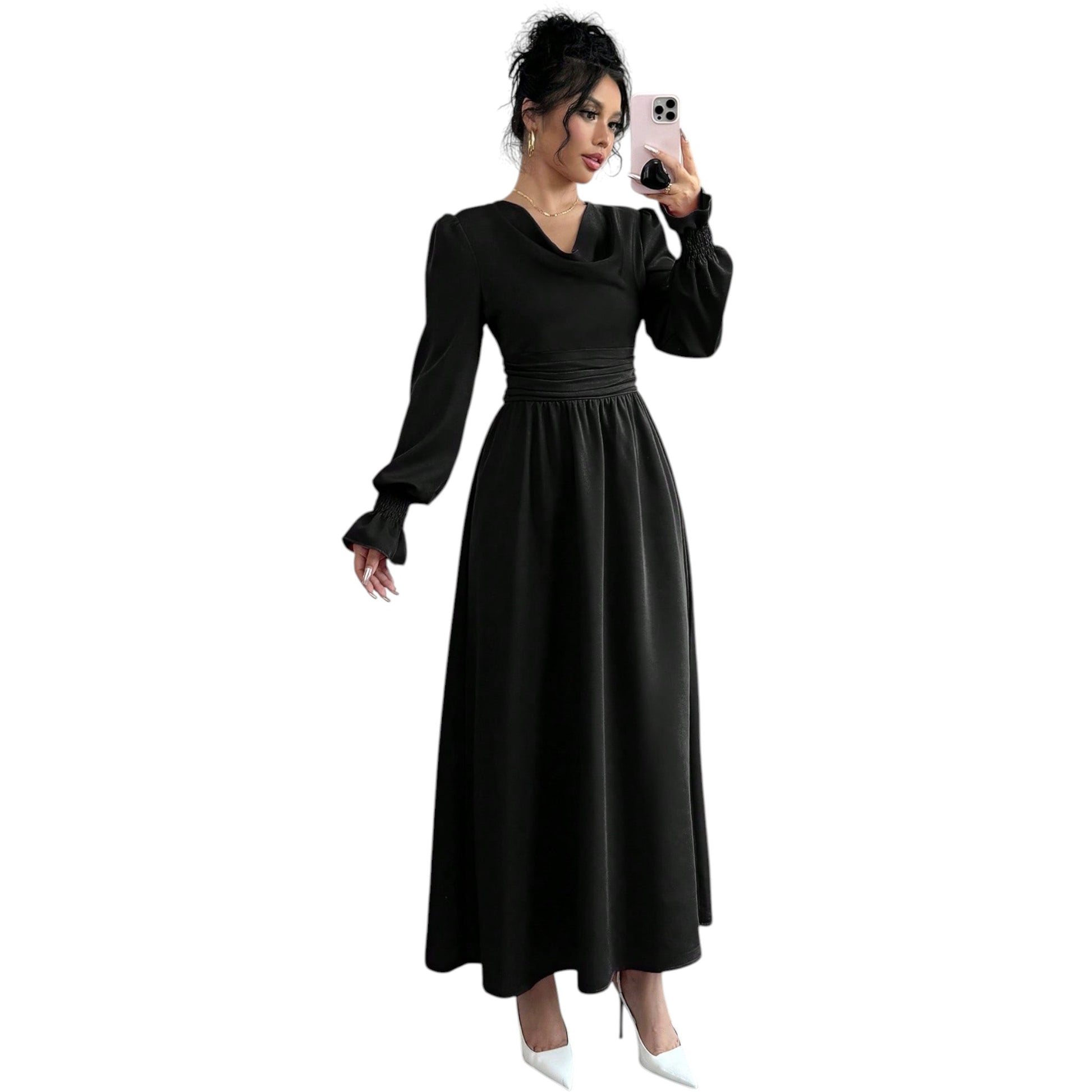 Címke nélküli, fekete, hosszú ujjú, V-nyakú, hosszú ruha.