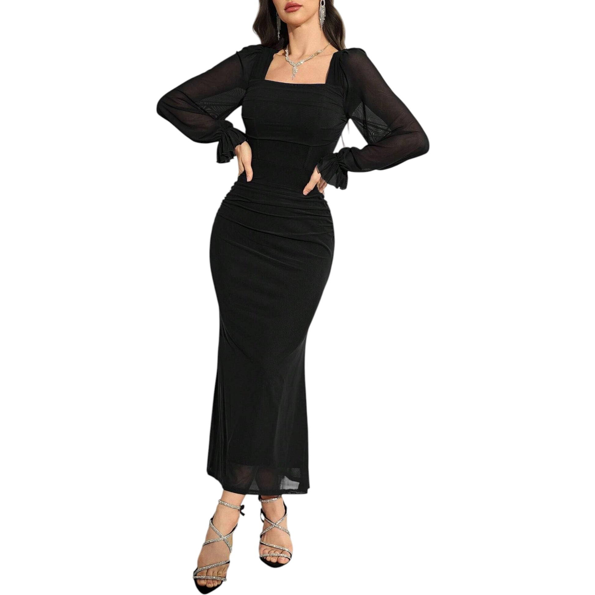 Címke nélküli, fekete, négyzet alakú nyakú, hálós, hosszú ujjú, testhezálló, maxi ruha.