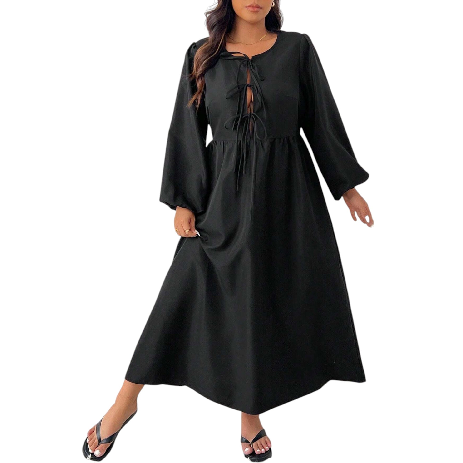 Címke nélküli, fekete, hosszú ujjú, bő szabású, maxi, kerek nyakú, elöl fűzős.