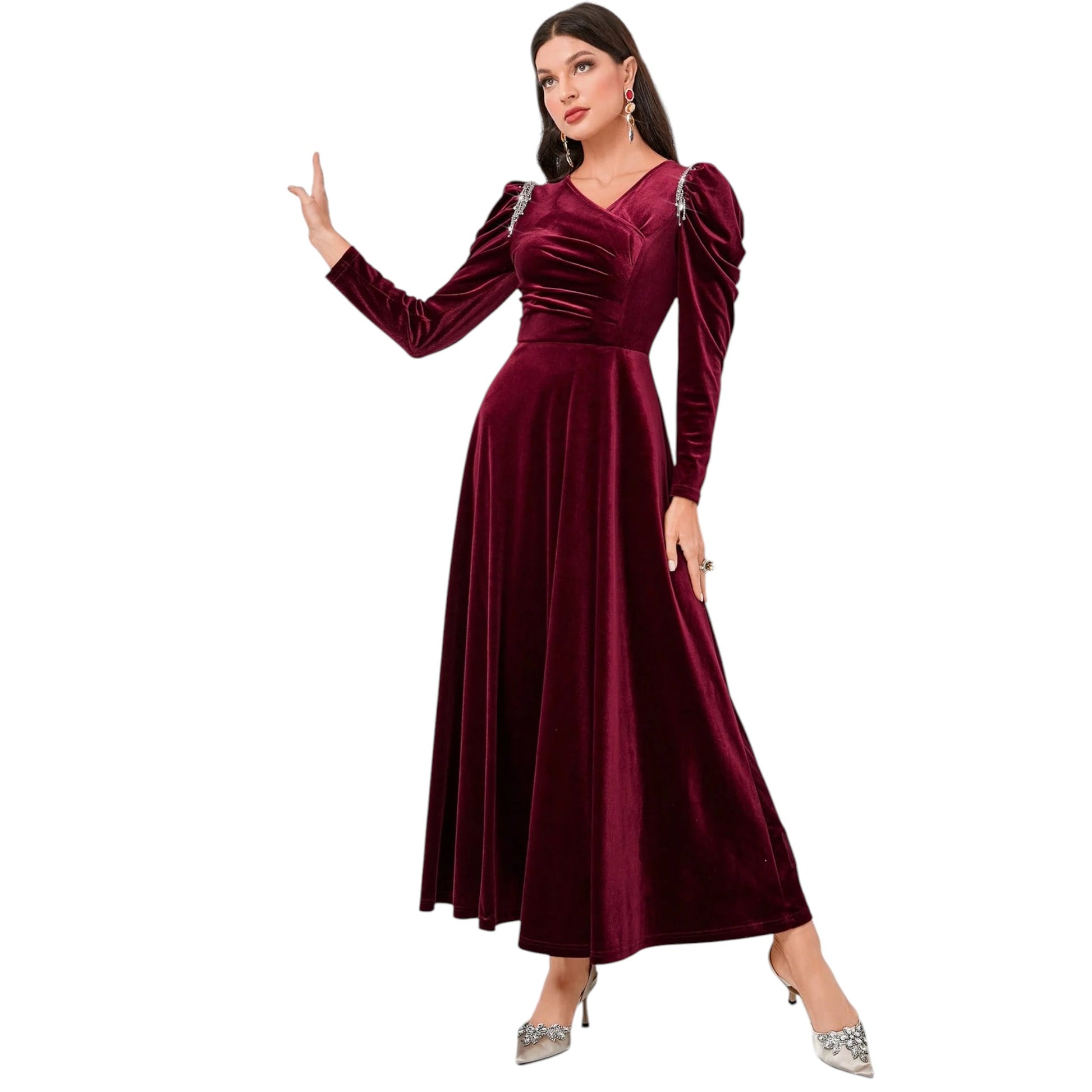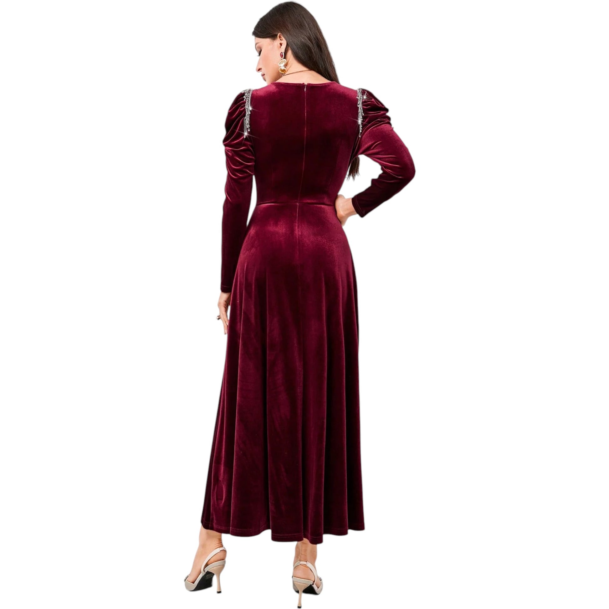 Címke nélküli, bordó, hosszú ujjú, V-nyakú, bársony, hosszú ruha, vállán strasszos díszítéssel.