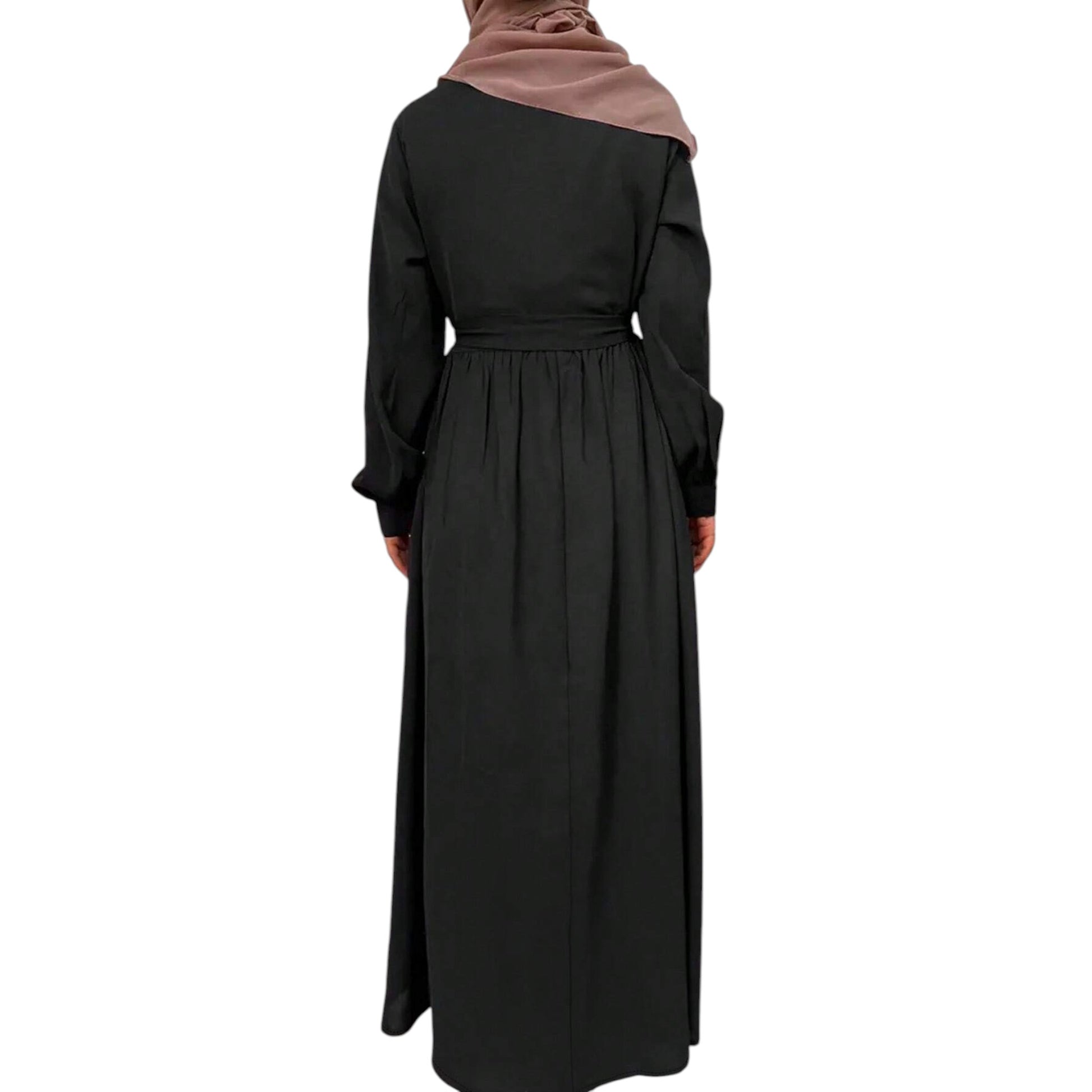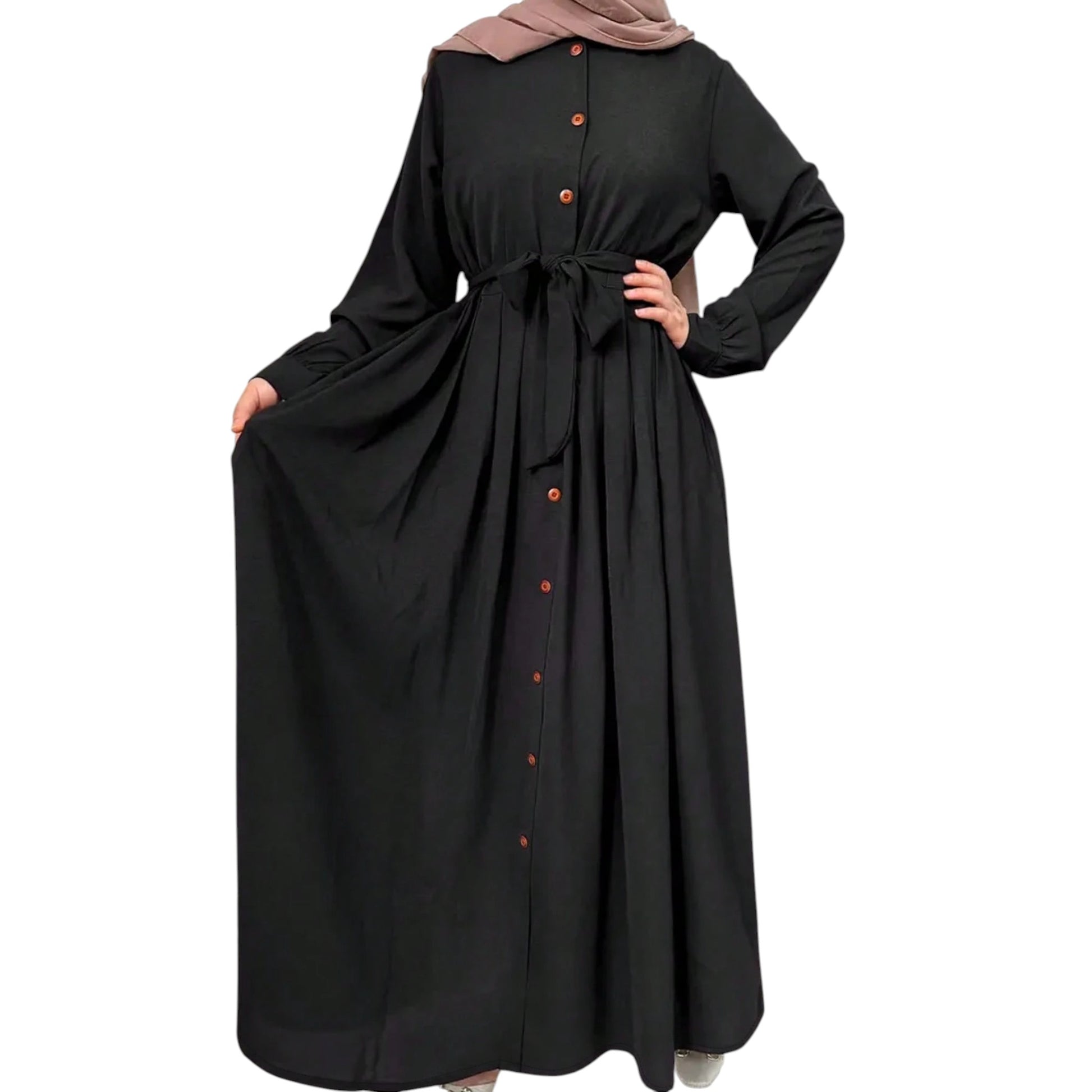 Címke nélküli, fekete, hosszú ujjú, gombos, bő szabású maxi ruha, karcsúsító derékrésszel.
