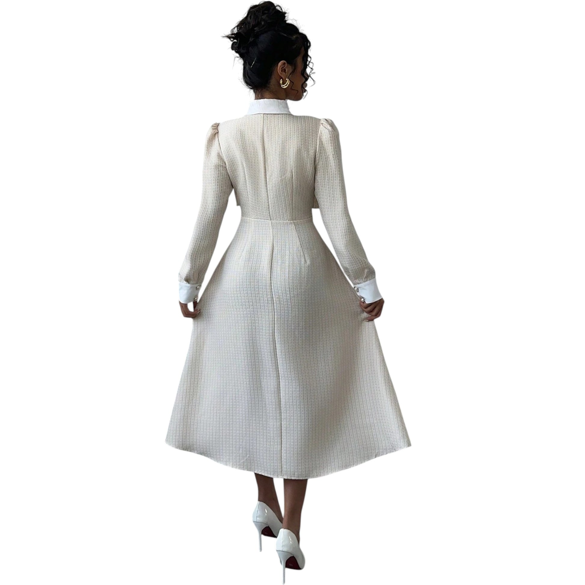Címke nélküli, bézs, tweed anyagú, hosszú ujjú, galléros felsővel résszel, valamint egy bővülő szabású, midi szoknyás résszel.