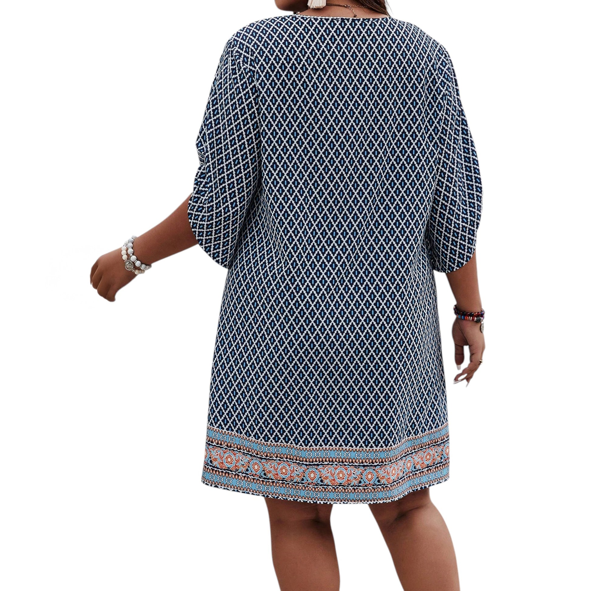 Címke nélküli, kék, V-nyakú, 3/4-es ujjú mini ruha, etnikai mintával és bő szabással.
