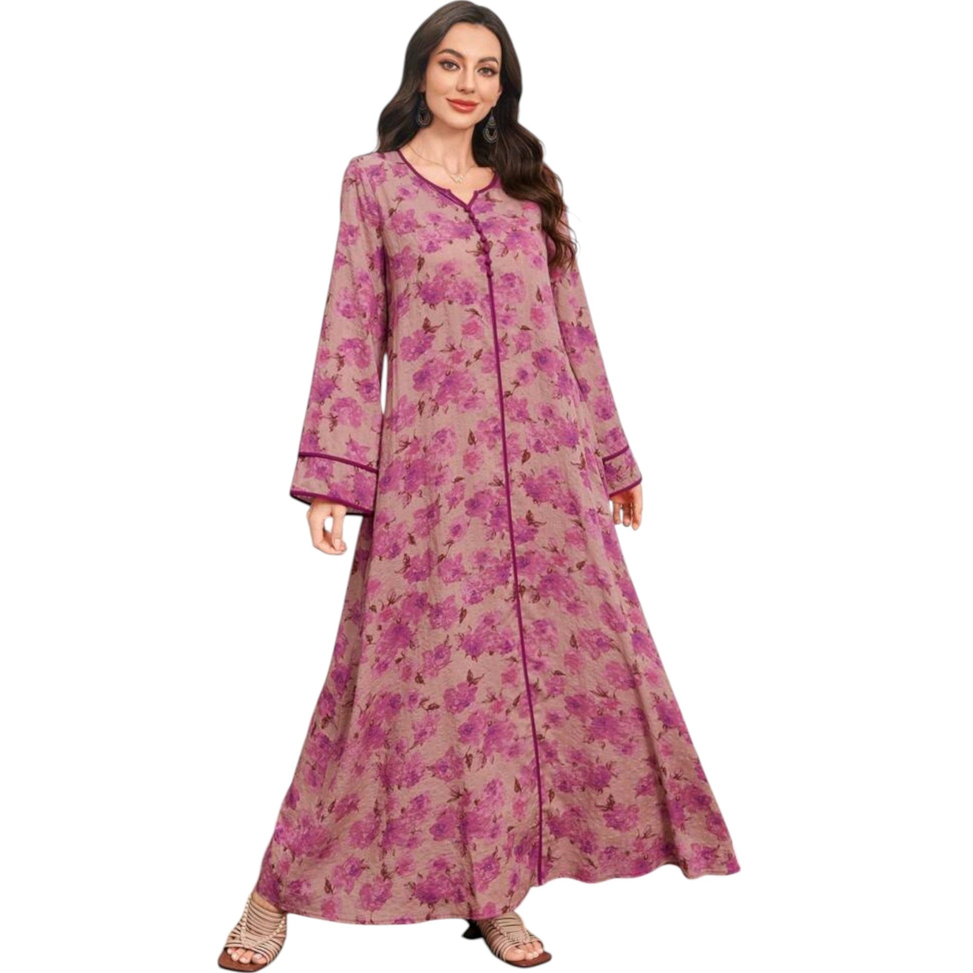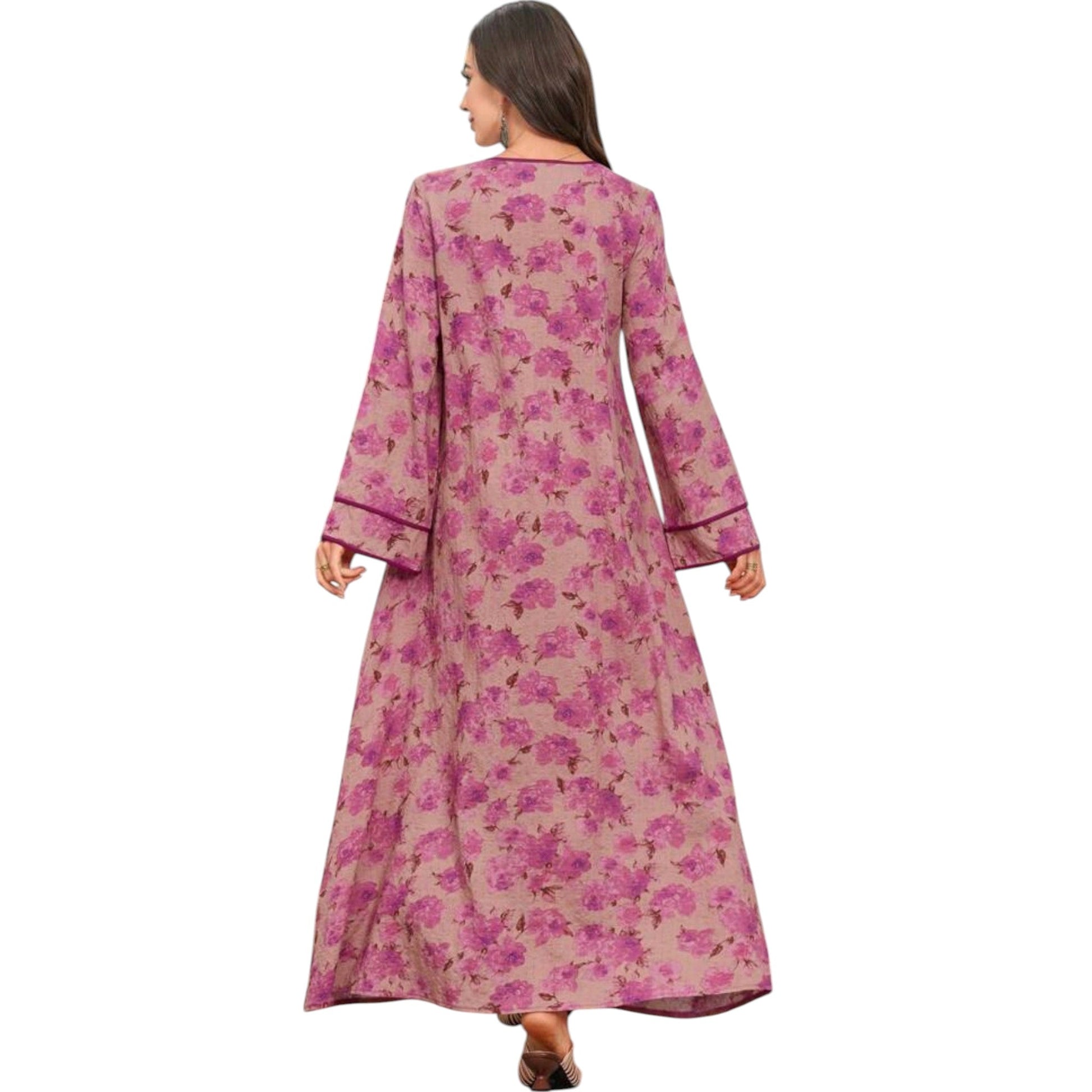 Címke nélküli, rózsaszín, virágmintás, hosszú ujjú maxi ruha, V-nyakkal és gombokkal.